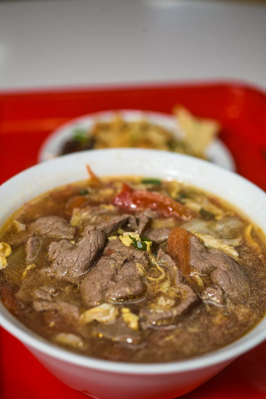 Customers often queue up outside Hehuan Knife-Cut Noodles’ second-floor location before it even opens!