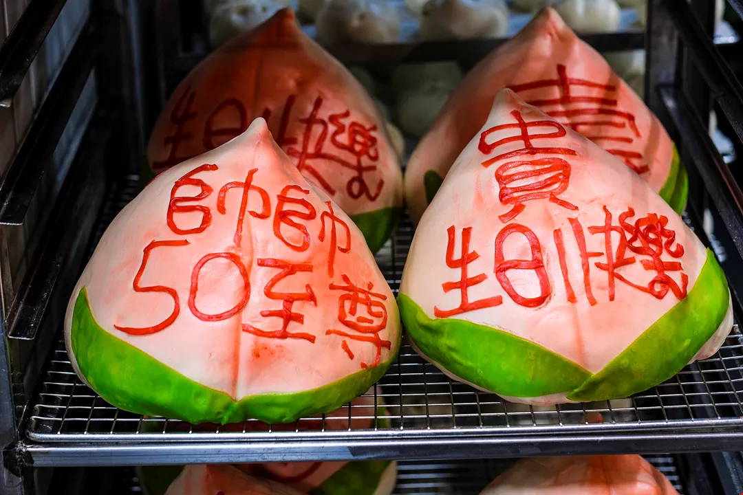 Hoshing cakes and dumplings carries giant longevity peach buns that are filled with many small buns.