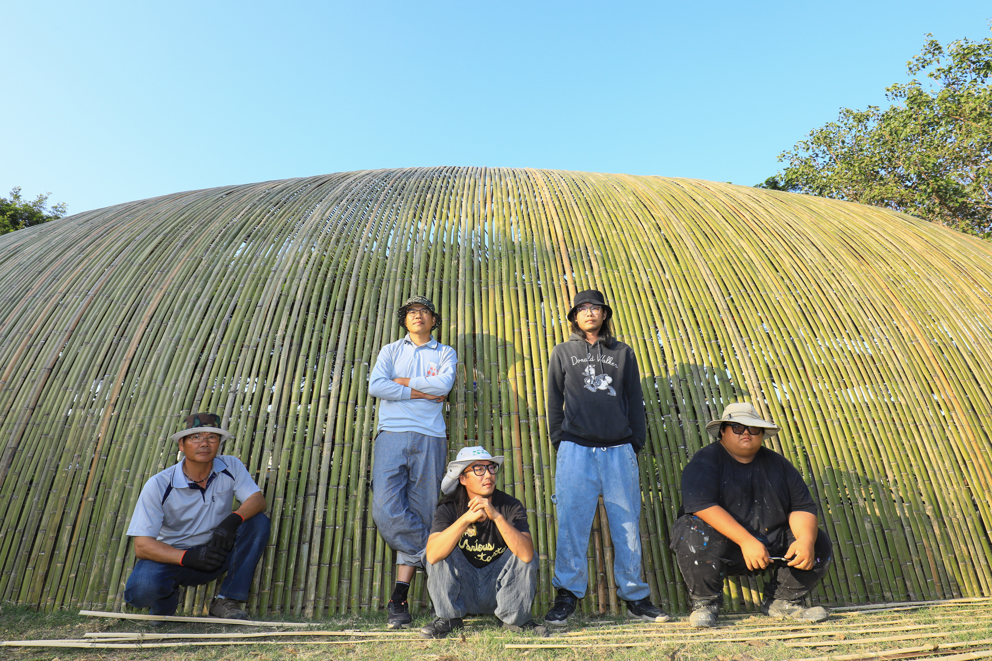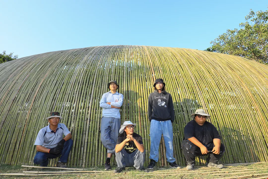 Chen Yu-lin (center), Chen Yu-ting (second from right), and their team from YuYu Art Studio hope to shine a spotlight on their hometown by enlivening it with art. Their work Time Light is behind them.