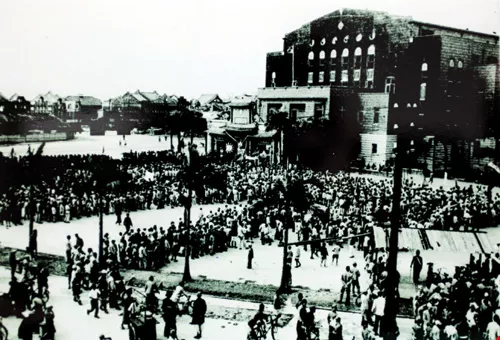On October 25, 1945, at Zhongshan Hall in Taipei, Governor Chen Yi and other officials of the incoming Nationalist Chinese government formally received authority over Taiwan from the departing Japanese colonial regime. The crowds gathered in the plaza celebrated the long-awaited return of Taiwan to its mother country.