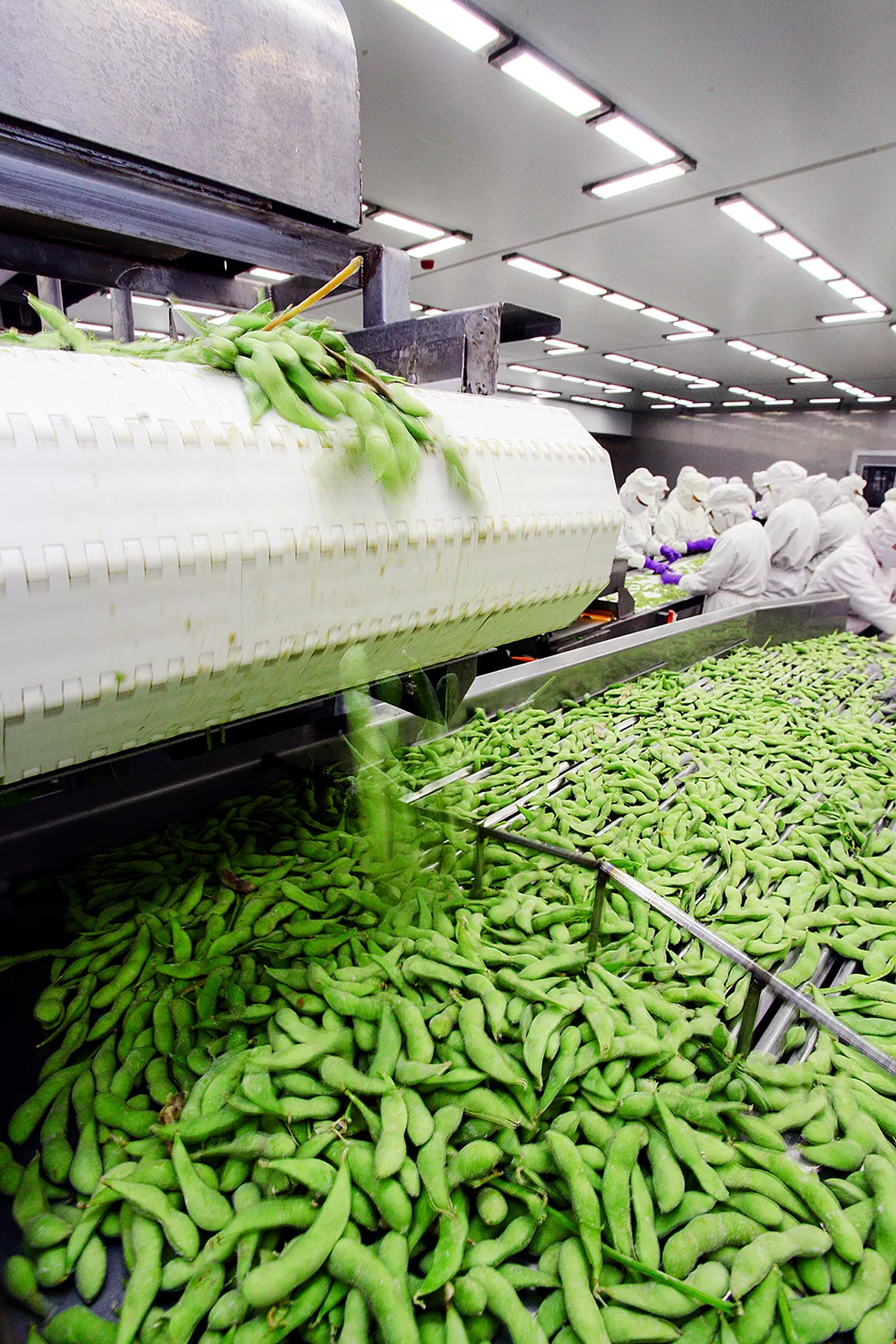 “Believe it or not, nowadays we can get edamame from farm to freezer in as little as three hours,” says Hou Chau-pai, president of Bai Sian Agricultural Products Co., Ltd. He explains that newly built processing plants have better capabilities and work faster. In the past, they were able to freeze three metric tons of vegetable soybeans per hour, but with current equipment they can freeze from eight to ten tons. At this accelerated rate, the processing time can be reduced.