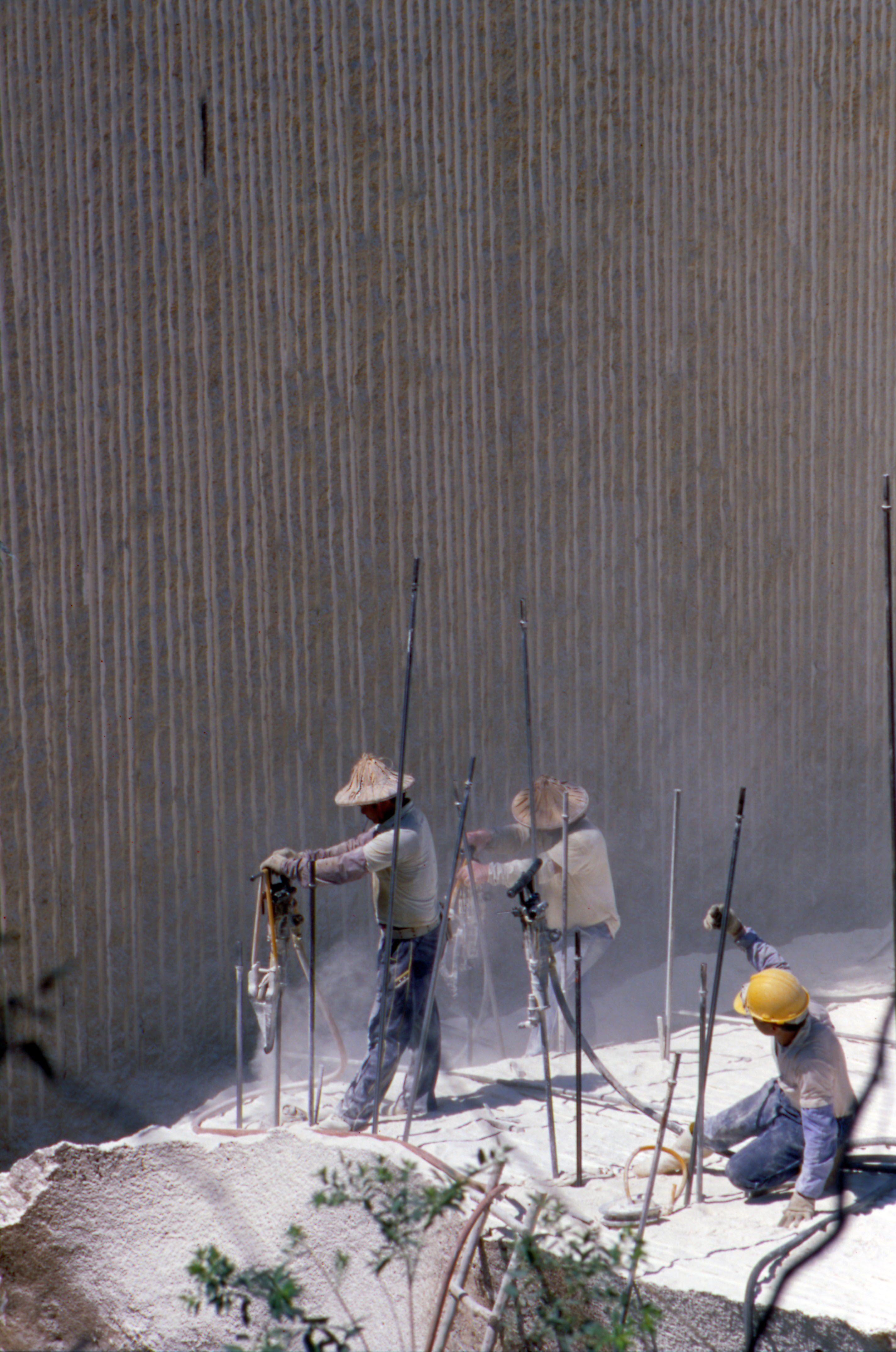 (Left) A large marble quarry near Tunghochiao. Workers drill steel rods into the rock and then split it apart.