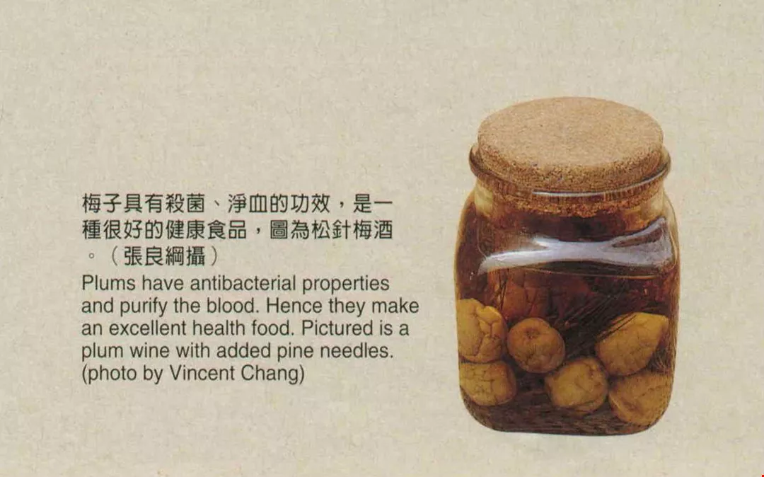 Plums have antibacterial properties and purify the blood. Hence they make an excellent health food. Pictured is a plum wine with added pine needles. (photo by Vincent Chang)