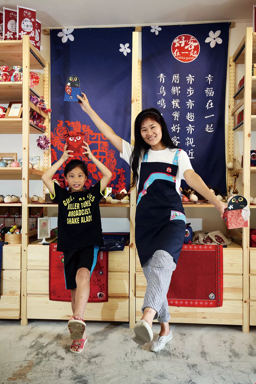 Liu Ying-hwa came to Shisanjian Old Street from Taichung City to open the first “cultural and creative gift shop” in Nanzhuang. She had the idea of transforming the Taiwan blue magpie, which is quite common in the nearby mountain forests, into a “harbinger of happiness” bird. Liu says: “The blue color represents the indigo-dyed clothes worn by Hakka people. Also the blue magpie stores food away, just like mothers in Hakka families make pickled mustard greens. Moreover, it is one of the few bird species that raise their young collectively.” These birds have become in her mind a symbol of the Hakka spirit, and they represent “friends and family working and living together.”