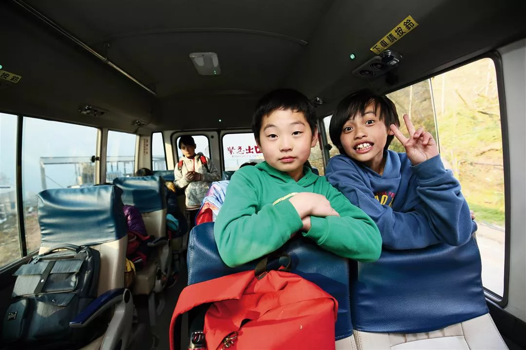 After resting for a bit in Lishan, at 5:00 p.m. Yu swaps out the 6506 sign for No. 6508 (Lishan to Wuling Farm) and goes to Lishan Junior High and Elementary School to pick up students, who are out of school for the day. The bus fills at once with life and laughter. Yu says he enjoys the innocence of children. He’s been transporting these kids for nine years. Along the way, the bus stops and the children swarm outside to a general store, where they purchase snacks for the rest of the journey. The sight of the children satisfied and laughing is another scenic image captured along the highway.