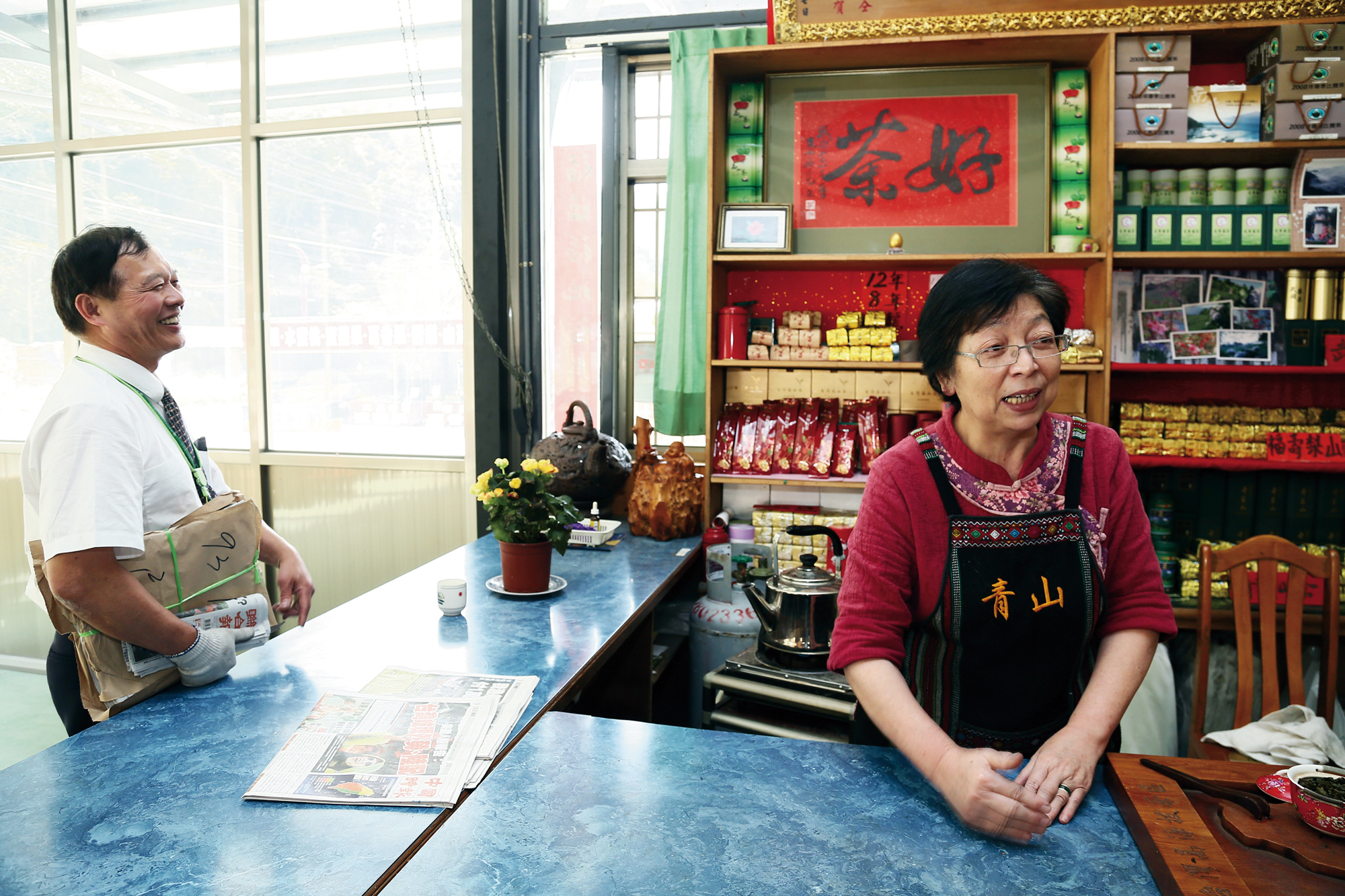 Yu Jiade regularly takes stacks of newspaper up to the residents of the mountains. His chats with Xu Xiuling of the Qingshan tea house are a daily occurrence.