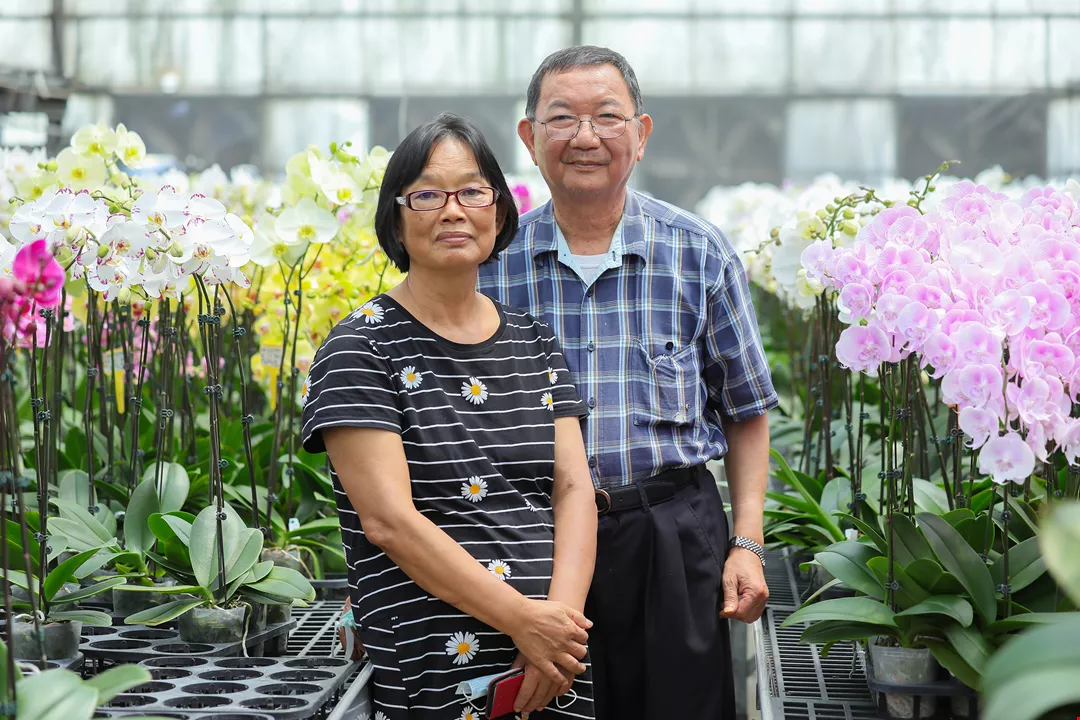 Lee Shu Mei (left) and Jian Wei Zuo (right) work together to make their family business, I Hsin Orchids, bloom.