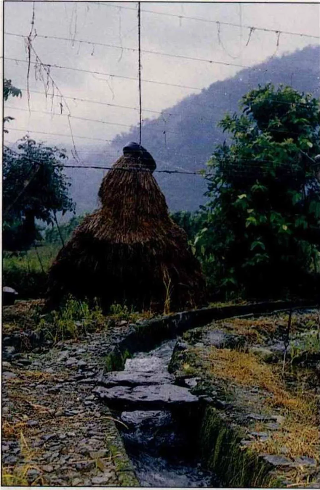 Rice straw can be used as fuel, to shade crops, and in many other ways; the slabs used to bridge the stream between the fields are of local stone. This typical country scene is in Chen Su-chiu's orchard.