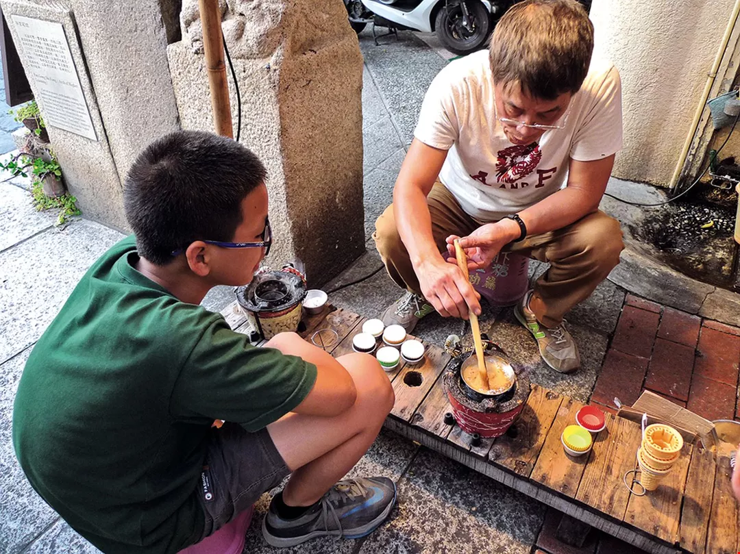 The photo shows authentic old-fashioned pengtang (a kind of caramel) being made in a shop on Fuzhong Street in Tainan.