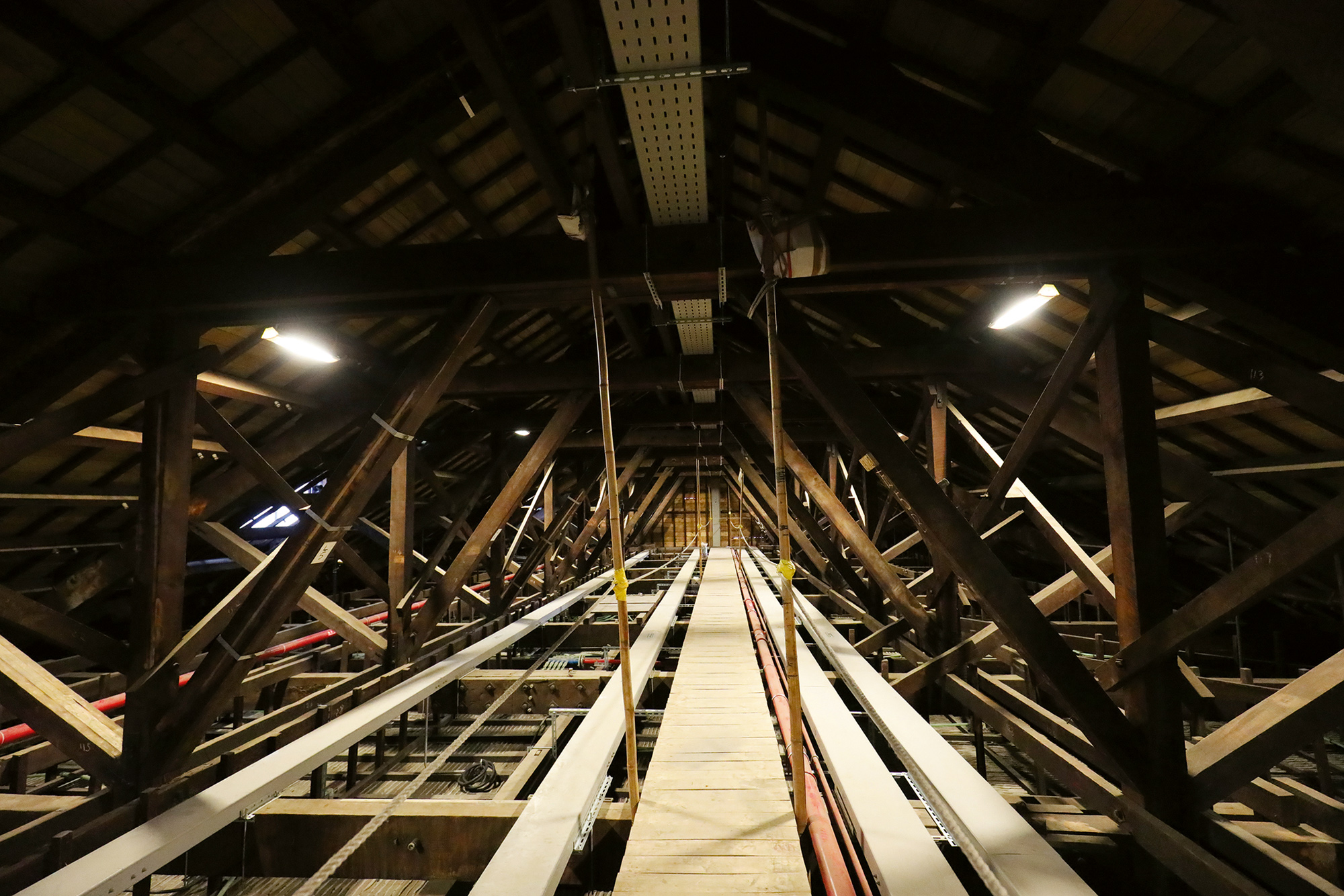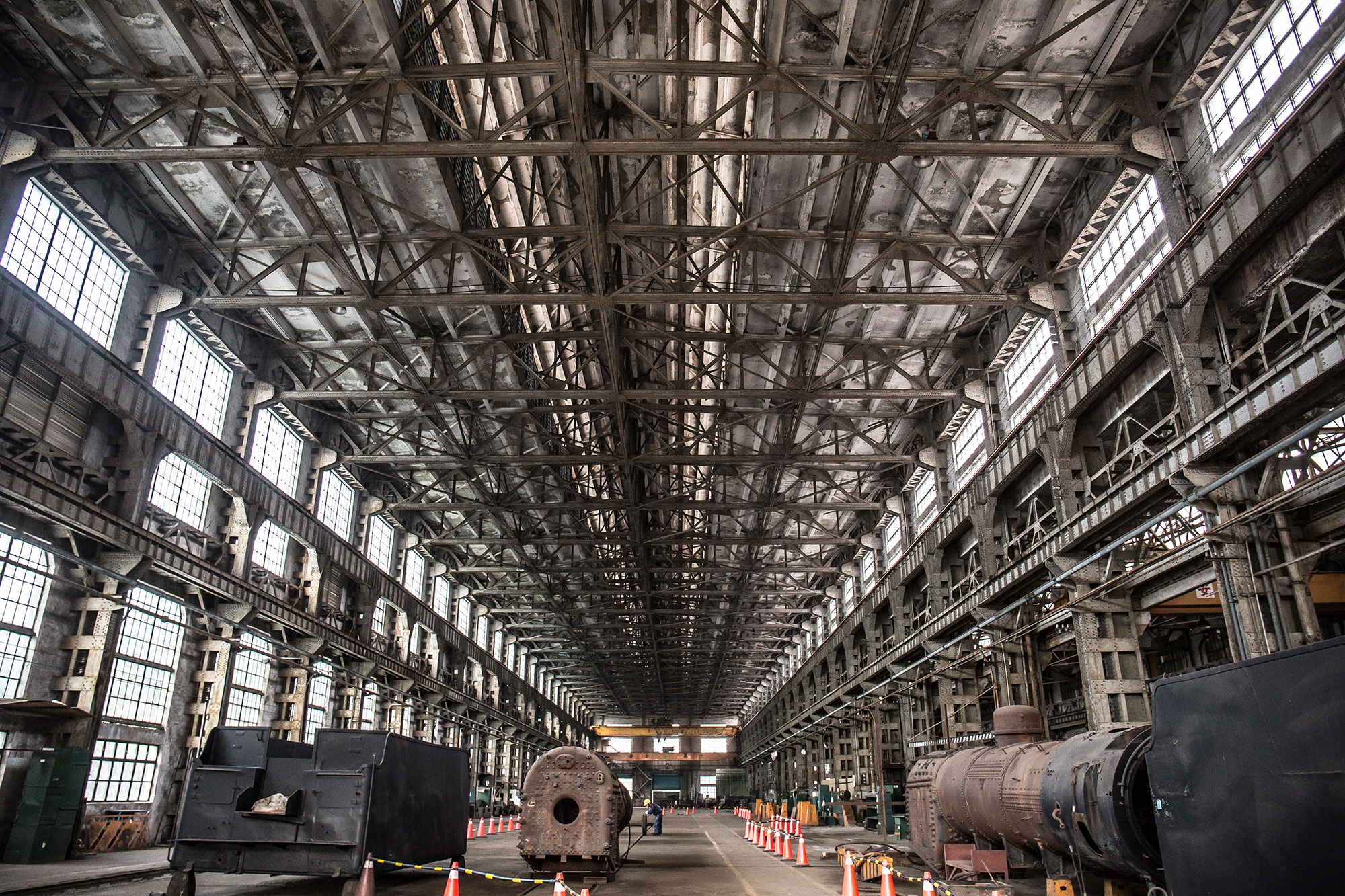 The erecting shop of the Taipei Railway Workshop features a vaulted ceiling supported by steel trusses. This is where steam engines used to be repaired. (photo by Lin Min-hsuan)