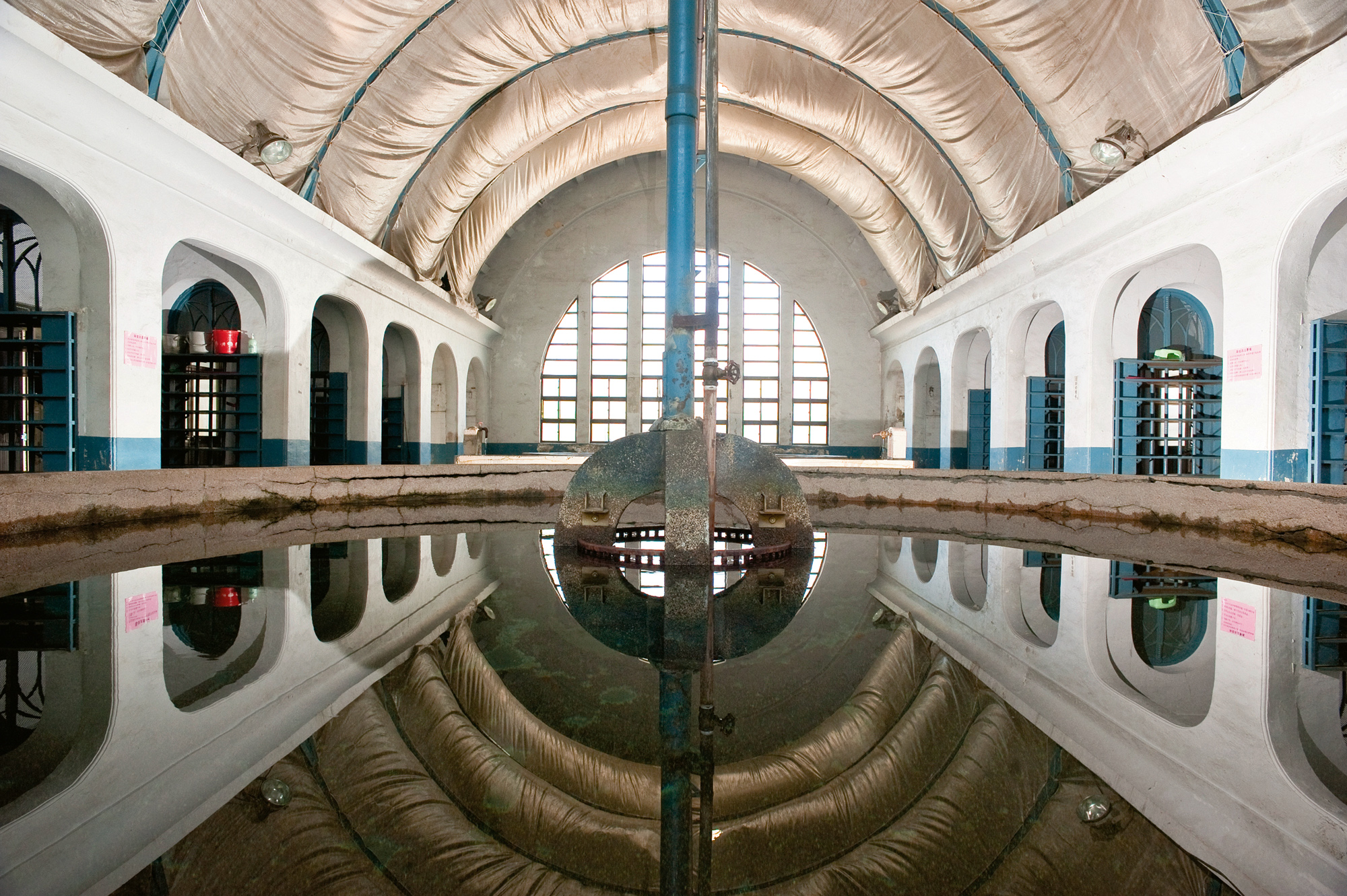 Many of the workshop areas’ floors are made of large blocks of cypress wood, with asphalt used to fill the gaps. The choice of flooring helped to absorb oil, dampen shocks and limit the damage from dropped heavy parts. The boilers in the engine room provided high-pressure steam to power a variety of machines at the plant. The excess heat was carried by pipes to warm the workers’ baths. After employees got off for the day, they could go for a soak to wash away their fatigue. By emphasizing the reuse of resources, it was a green design of its era.