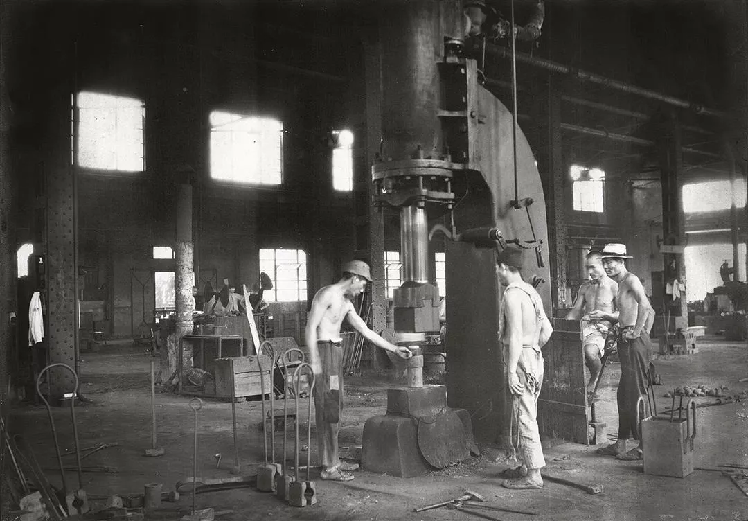 An old photo of workers at work in the forge and metallurgy shop. (courtesy of the Bureau of Cultural Heritage, MOC)