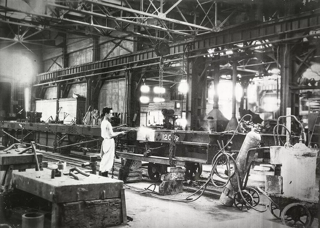 An old photo of workers at work in the new coach shop. (courtesy of the Bureau of Cultural Heritage, MOC)