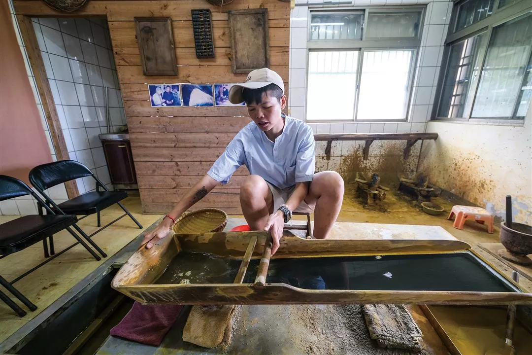 Inside the Jioufen Teahouse, one can see the tracks of history, whether in its shrine hall or in the mineral paint still visible on the Fuzhou cedar plank walls. Fond of collecting antiques, Hung furnished the space with vintage pieces, such as an old dressing table and a traditional eight-legged bed. These have only added to its nostalgic charms.