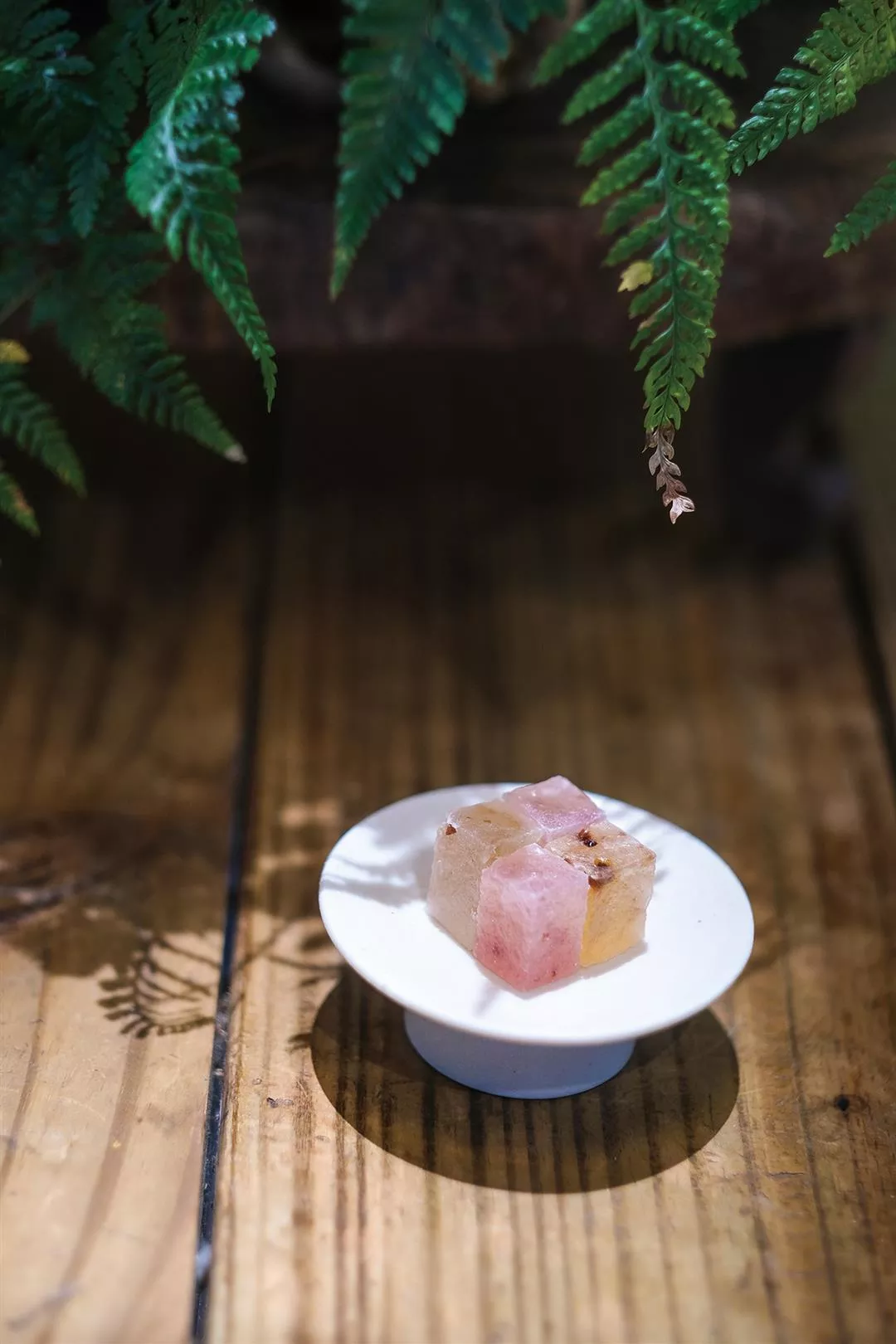 Beyond tea drinks, Yeshi has also branched out into related creative endeavors. For example, Yeshi offers classes where participants create herbal pouches, bringing them closer to plants through smell and touch. In recent years, they have also started making amber candy, using wagashi confectionery techniques to incorporate local Taiwanese produce. One example is candy made from Beitou tangerines that highlights not only the sweet–tart flavor of the fruit but also the fragrance of the peel and the freshness of the blossoms and leaves. Each little candy expresses the local terroir in concentrated form. By bringing herbs into daily life, Aaron Li has rooted his dream in Jiufen.
