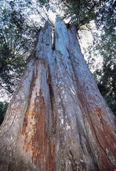 As for the Taiwan red cypress-merihi in Japanese-it is even more magnificent in appearance than the Taiwan yellow cypress. But the Taiwan red cypress's trunk is often divided, and because it mostly grows in wet river valleys the heartwood is prone to be eaten away by bacteria, producing strangely tangled hollow trees. The crown is also broad and difficult to cut. This is why the gigantic ancient trees that have escaped the loggers' chainsaws, such as those at Mt. Ali and Mt. Lala, are all Taiwan red cypress.