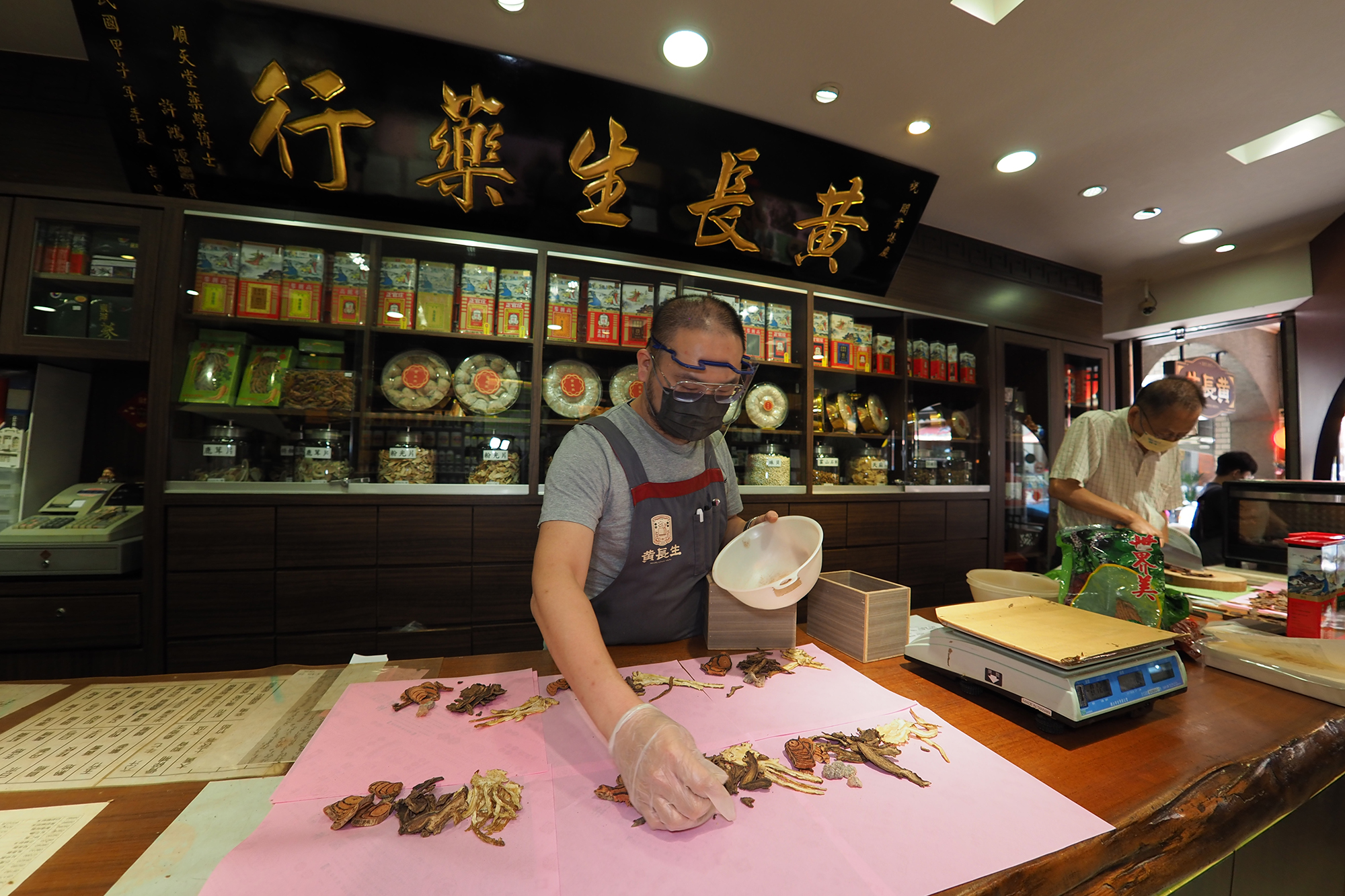 Older customers make a special trip to Huang Chang Sheng Traditional Chinese Pharmacy to see their prescriptions being made up. The ritualistic process imparts a benevolent atmosphere.