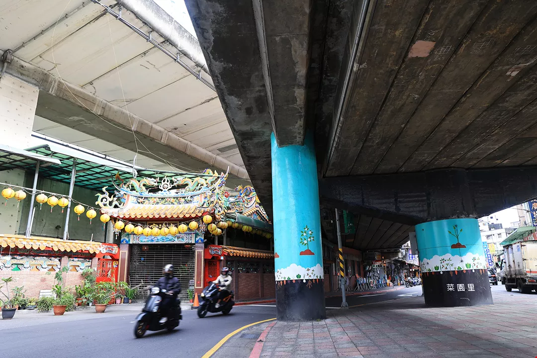 Wanhua’s Shuiliangong Temple is squeezed into a small triangle of land underneath two highway overpasses and beside a river dike.