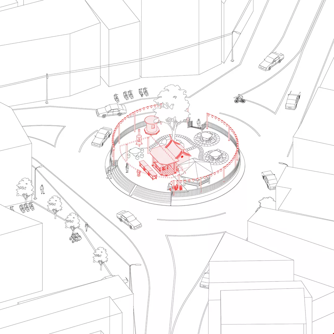 Lai Po Wei employs architectural illustrations to better reveal the relationship between temples—in this case a roundabout temple—and their environments. (courtesy of Lai Po Wei)