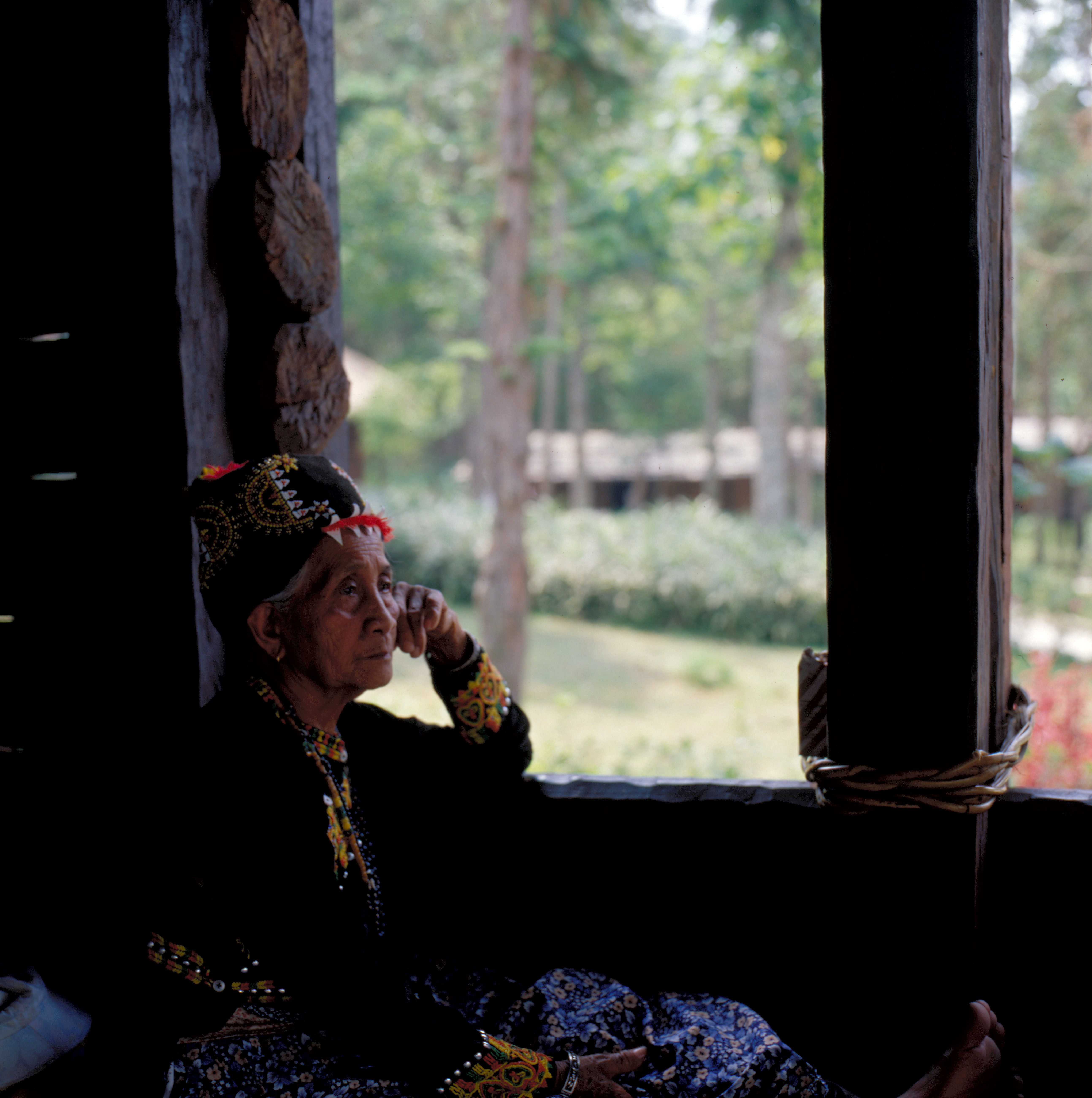 (Below) This old woman deep in thought is a "model" at the Aboriginal Culture Village. Can you guess which tribe she is from?