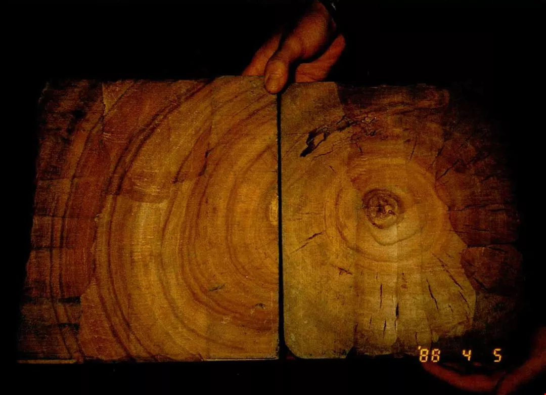 (Above) Stout camphor wood, on the left, has a fine, dense texture resistant to cracking. The ordinary camphor wood on the right is not very old. (photo courtesy of Huang Rueyshyang)
