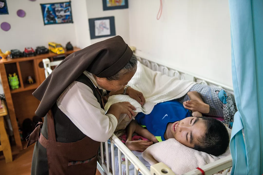 “I beseech Thee, O Lord, to look after them with vigilance that they might rest well and be healthy, safe and content.” Each night, Sister Mary prays at the bedsides of these disabled youngsters, one by one. She chats with them and kisses them on their foreheads, a heartwarming rite she has carried out without interruption for decades.