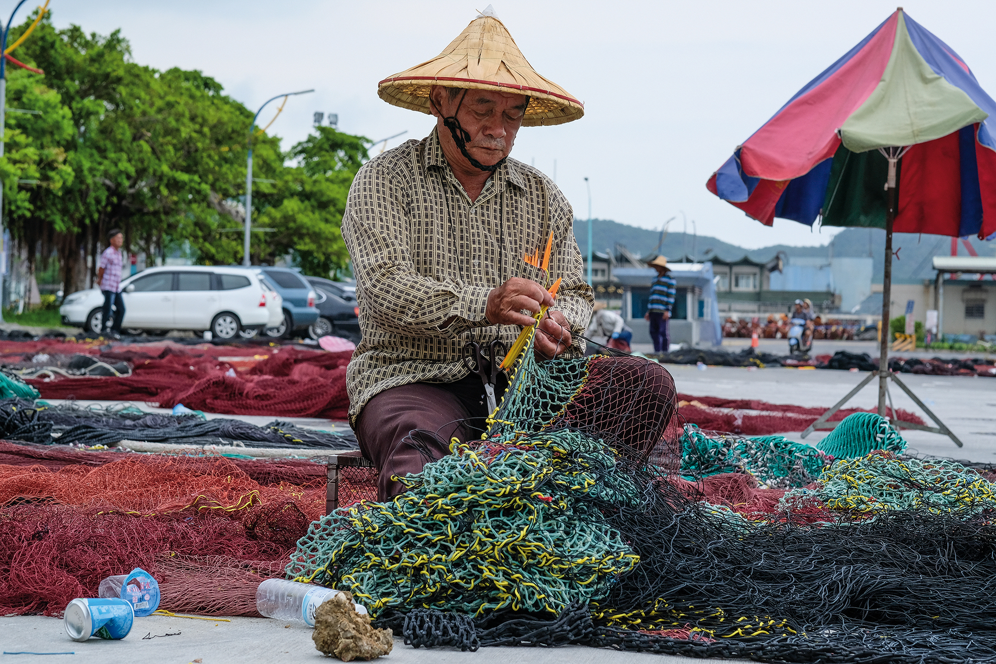 A fisherman with a weathered face deftly repairs a net beside the harbor. (photo by Chuang Kung-ju)