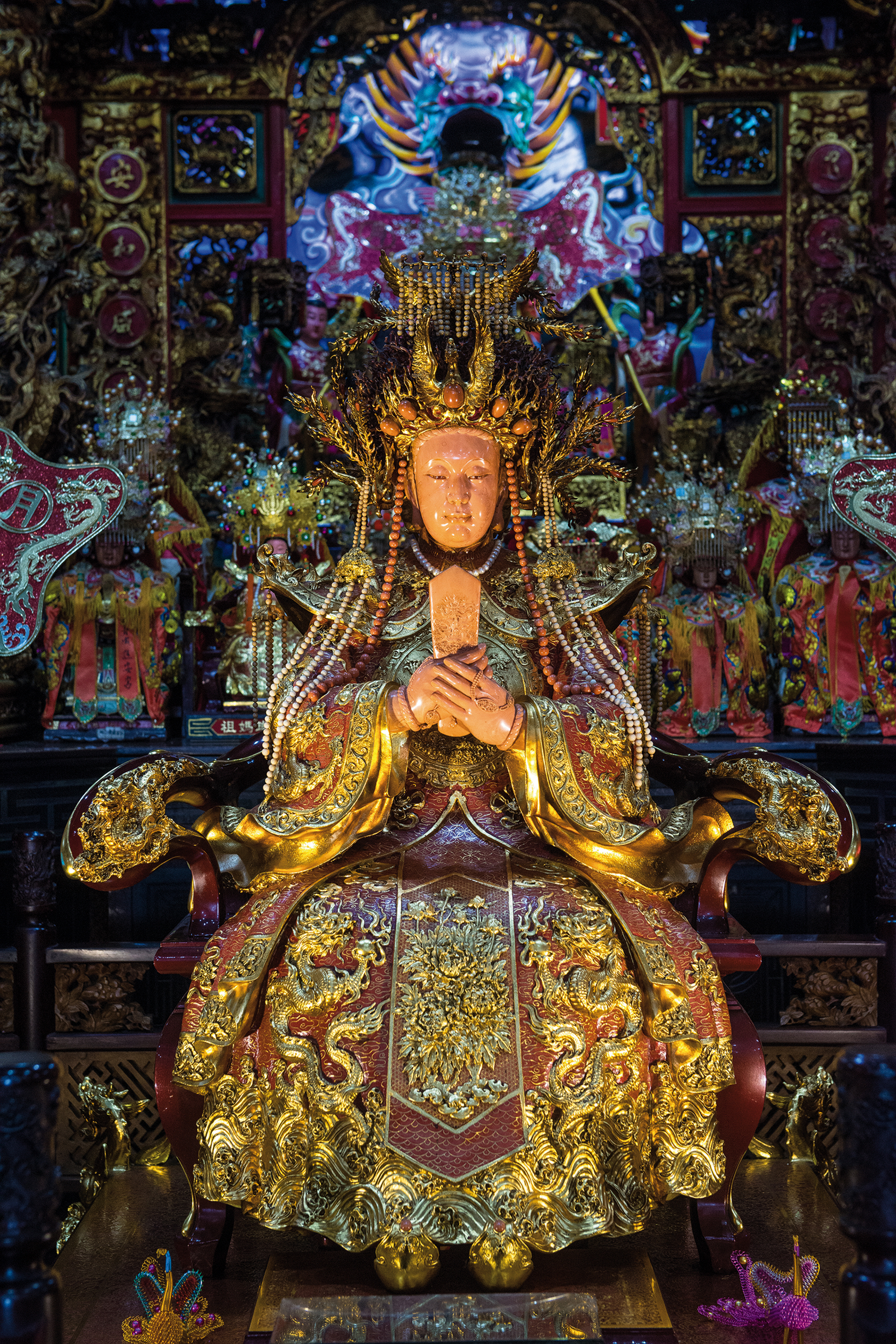 Known far and wide, the gold and coral Mazu at the Jin’an Temple plays an important role in local religious life. (photo by Chuang kung-ju)
