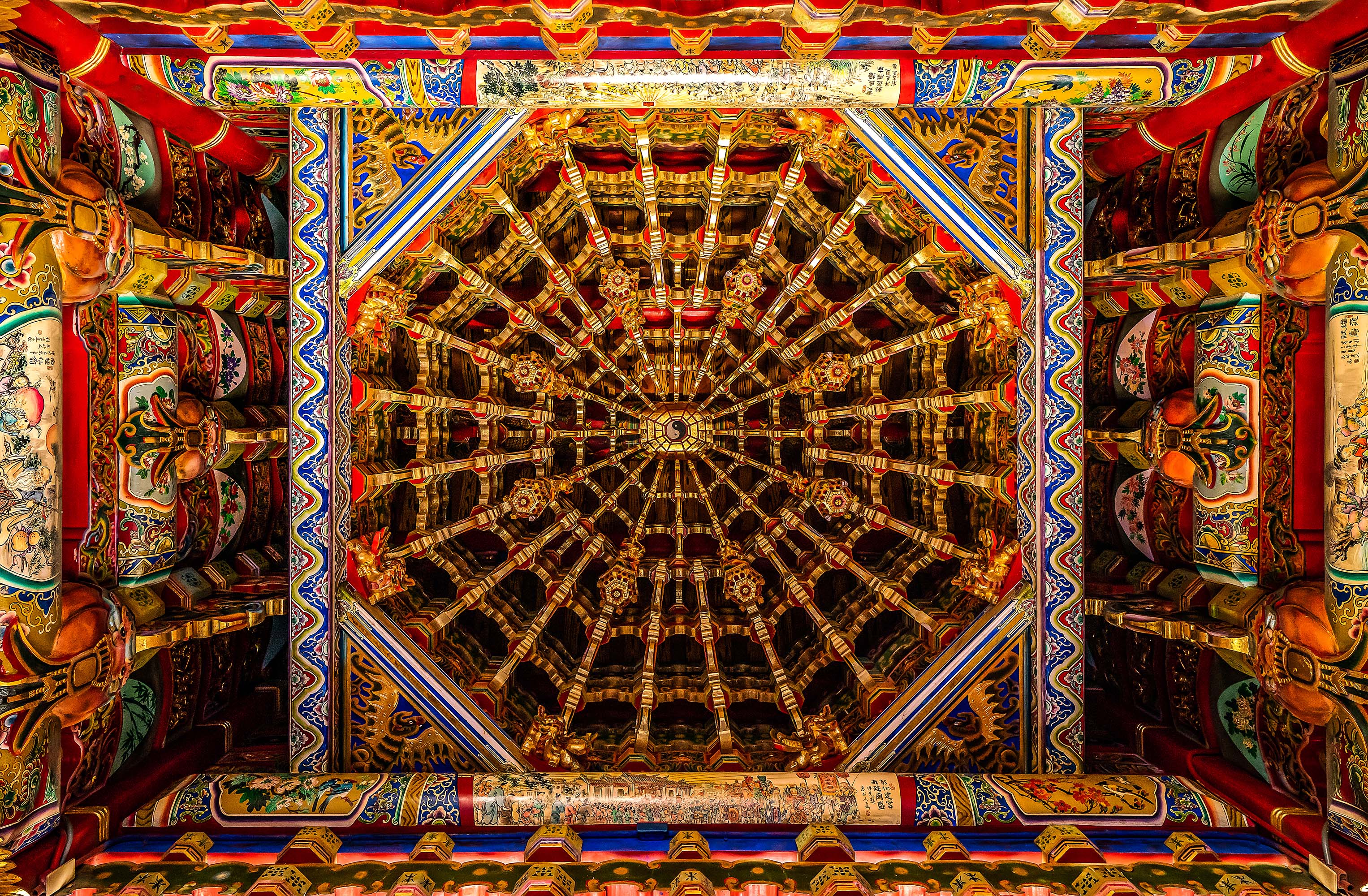 On entering the main hall of Bengang Tianhou Temple in Chiayi, we look up and see directly above us a magnificent octagonal caisson ceiling. “Temples with caisson ceilings are the most beautiful,” says master carpenter and joiner Liu Shengren, our guide for this visit. The bucket arches (dougong) that rise layer upon layer are all connected by crafted wood joints, without the use of a single nail. However, not all temples have decorative ceilings of this kind, for a caisson ceiling is not only symbolic of a temple’s size, it also represents the skill of the master joiner who constructed it.