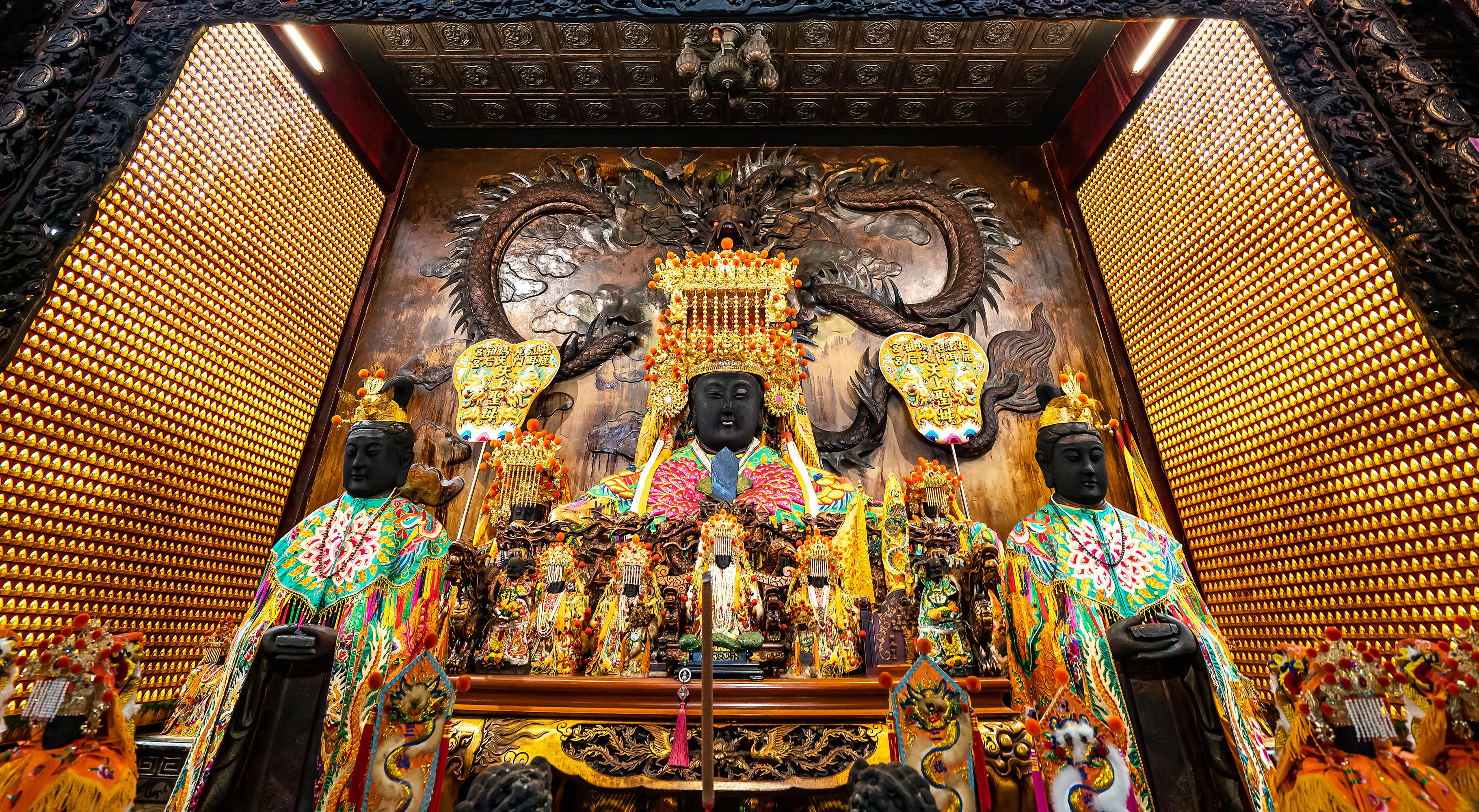 The Mazu statue in the main hall at Lu’ermen’s Tianhou Temple is 388 centimeters tall. Guo Chunfu, a master maker of deities’ headgear, specially made a crown for the statue, enhancing the majesty of this “Empress of Heaven.”