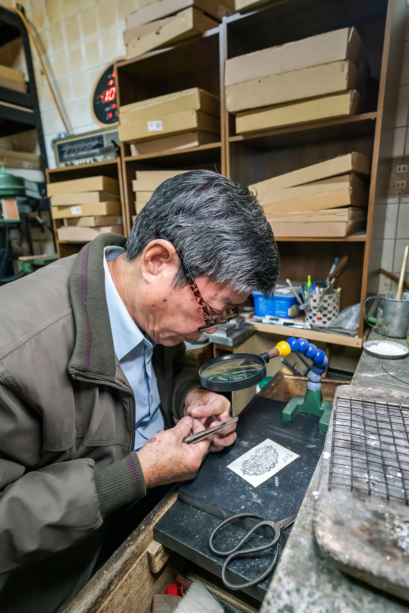 It is 2:30 a.m, and in the basement of a private home in Tainan’s South District, the flame of a soldering torch plays over strands of fine silver wire. Guo Chunfu, working with a magnifying glass, carefully shapes the wires according to a design he drew himself, soldering them onto a silver plate point by point. Each and every component of the different types of deities’ headgear that Guo makes is the result of complex work processes that he repeats day after day at his workbench as he gradually creates these items. Working entirely by hand, it takes him at least several months, and sometimes over a year, to complete each piece. This is how the crowns of the Mazu at Lu’ermen’s Tianhou Temple and the Second and Third Mazu at Tainan’s Grand Mazu Temple came into being.