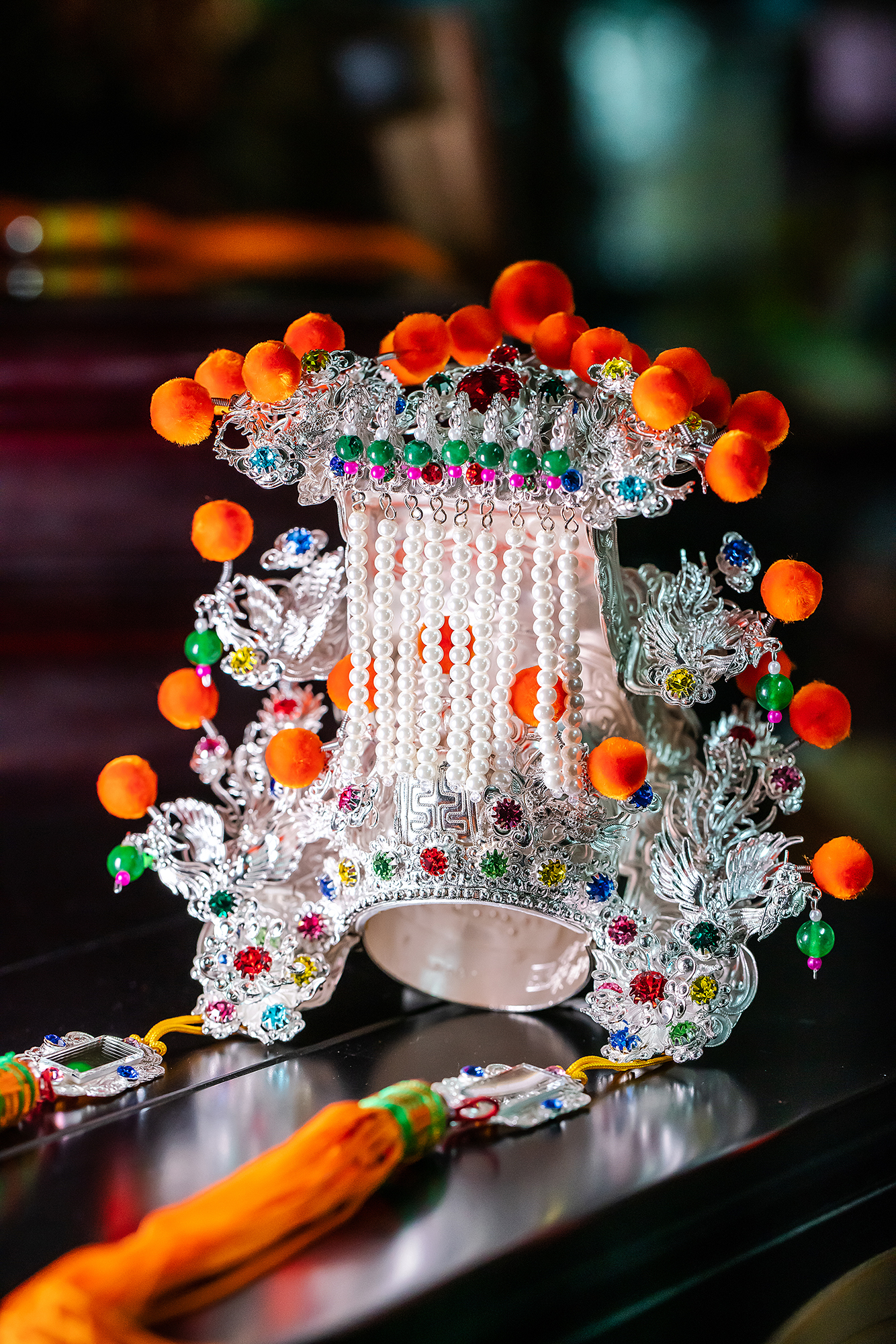 This beautiful Mazu crown, with a circumference of around 12 cm, is adorned with nine dragons and four phoenixes. Each of the decorative patterns is meticulously crafted by hand.