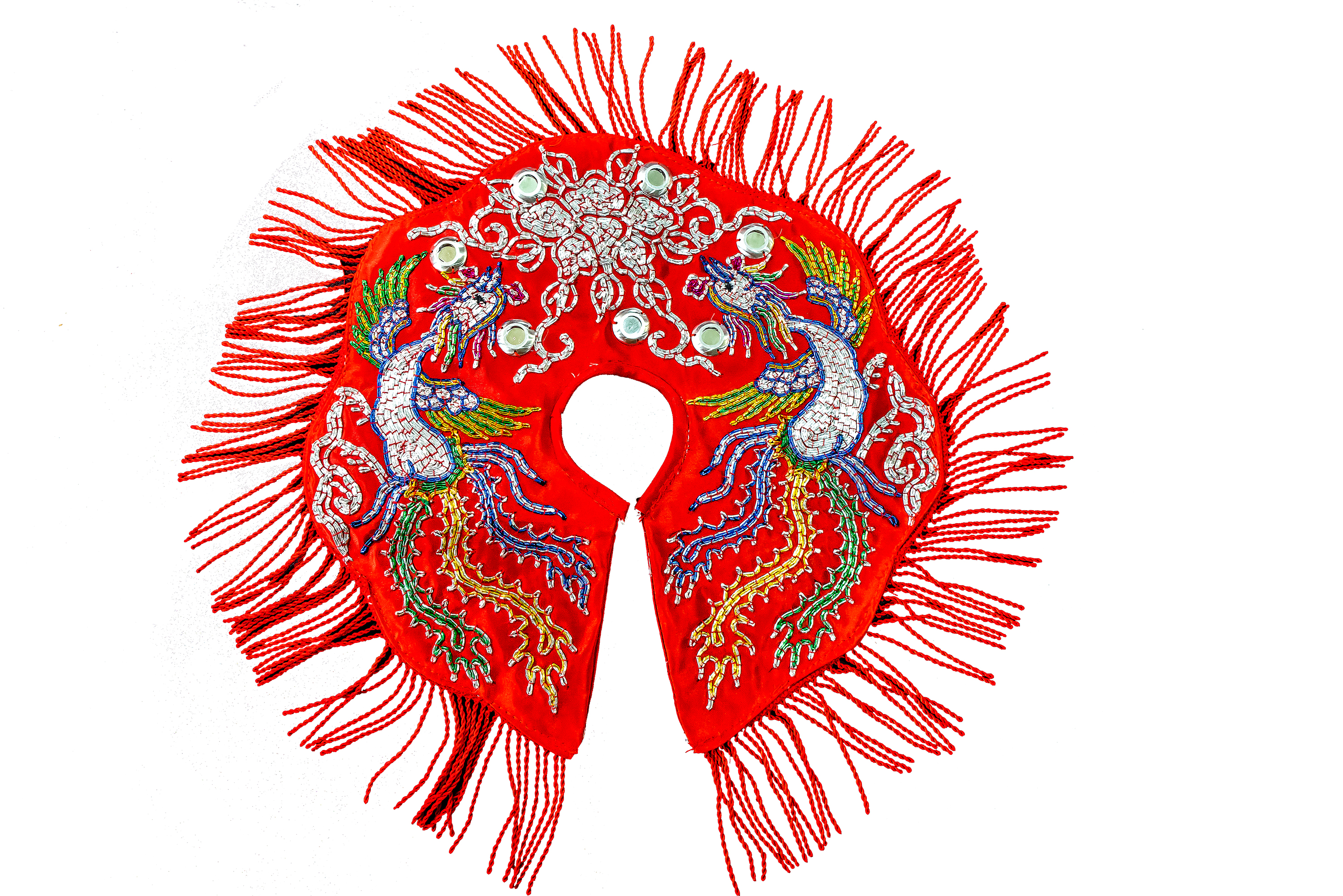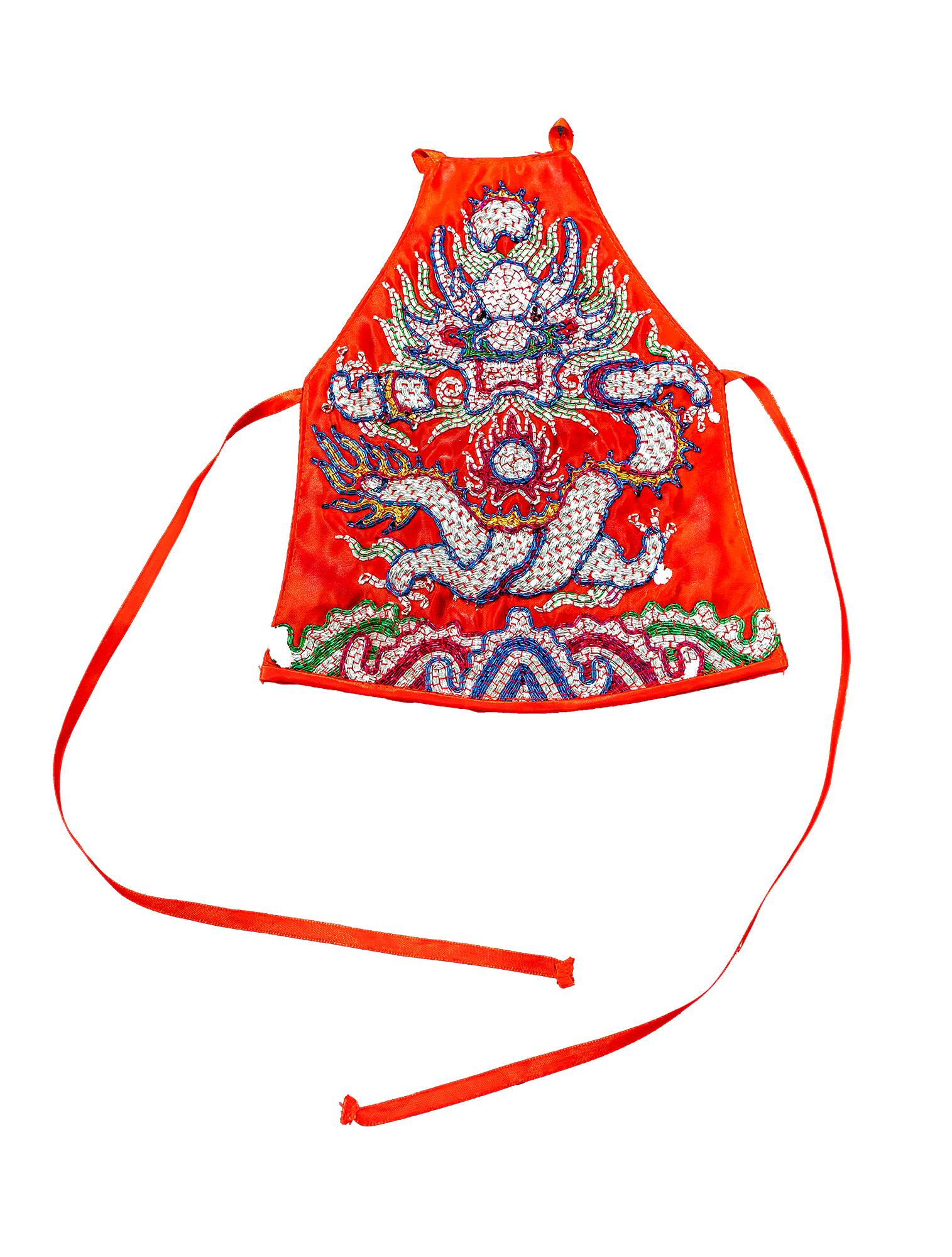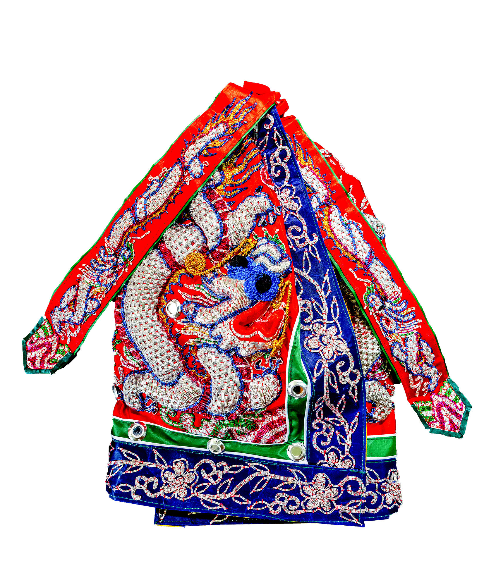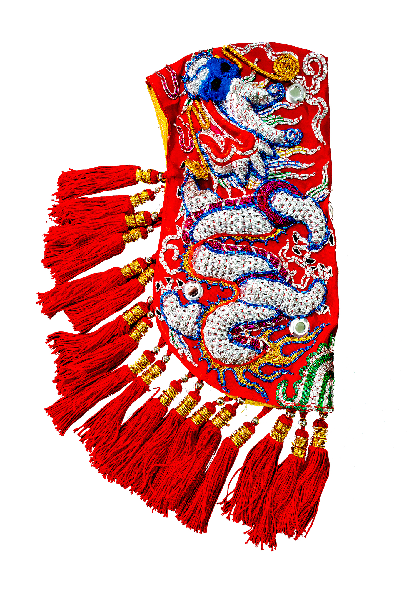 The clothing for a Mazu statue includes an outer garment, a dudou apron, a shawl, and headgear. These items are embroidered with motifs indicative of Mazu’s high status, including dragons and phoenixes.
