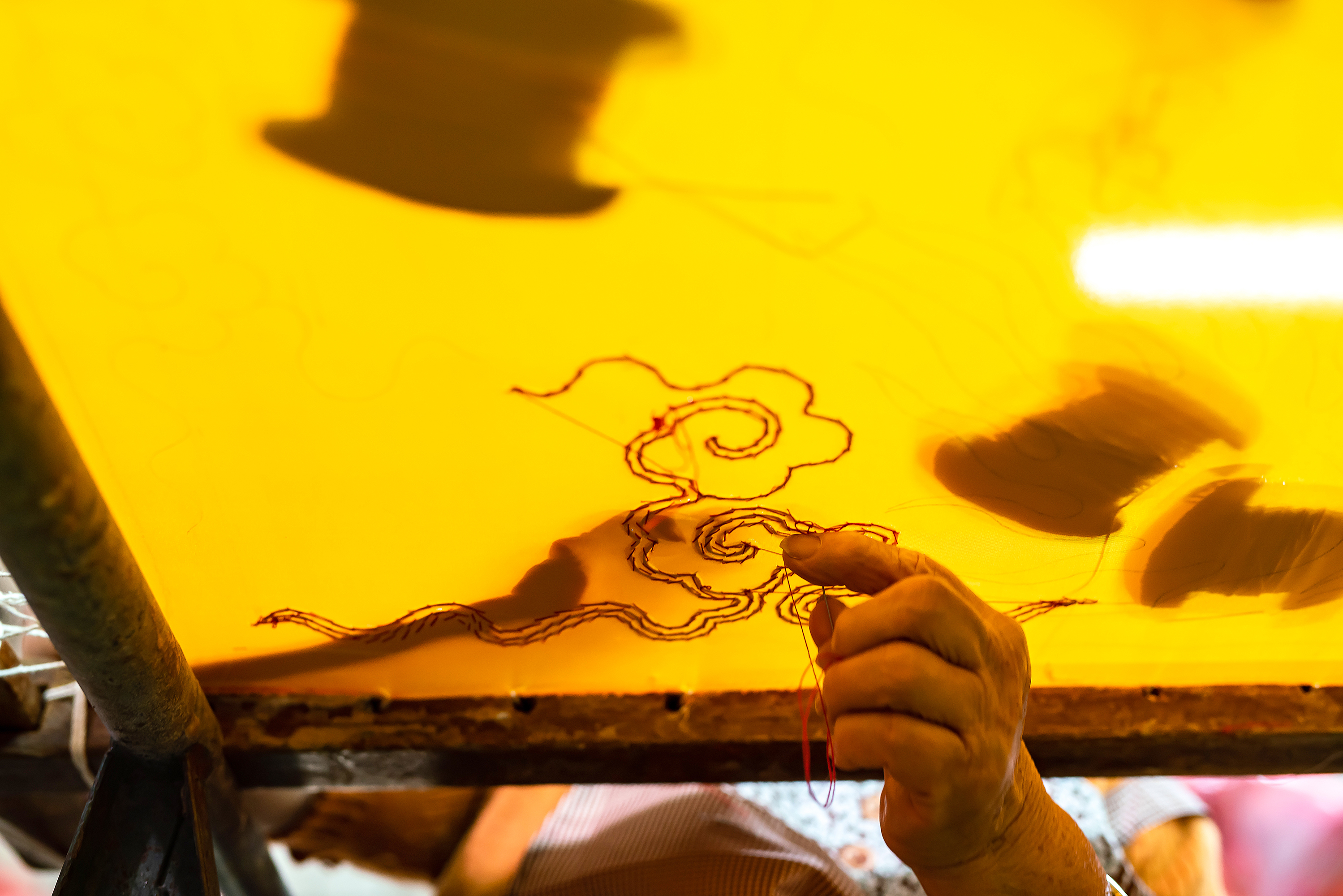 As times changed, manpower became increasingly expensive and there was growing competition from inexpensive embroidery from China. Therefore Zhang switched her workforce from doing embroidery entirely by hand to using sewing machines for some elements. Also she began using polystyrene foam for the raised embroidery, which in earlier days was padded with hand-rolled cotton wadding. Zhang says that while polystyrene foam is quick and easy to use, it is less flexible, whereas with cotton wadding one can more finely vary the height of the raised embroidery, giving vitality and energy to the finished product.