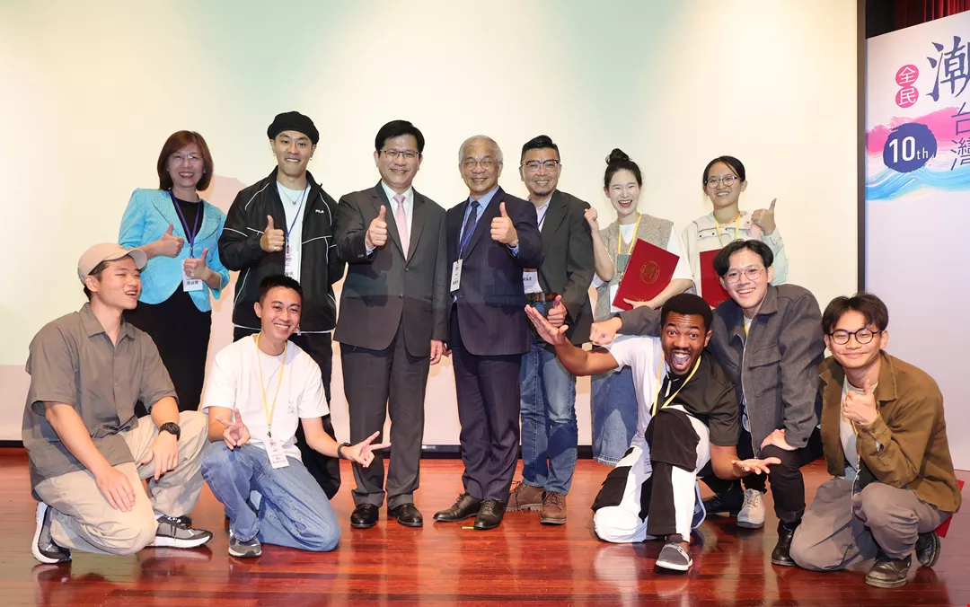Foreign Minister Lin Chia-lung (back, third left) posed for photos with the winners of the Reel-Style Short Video category, and expressed high praise for their creativity and dedication.