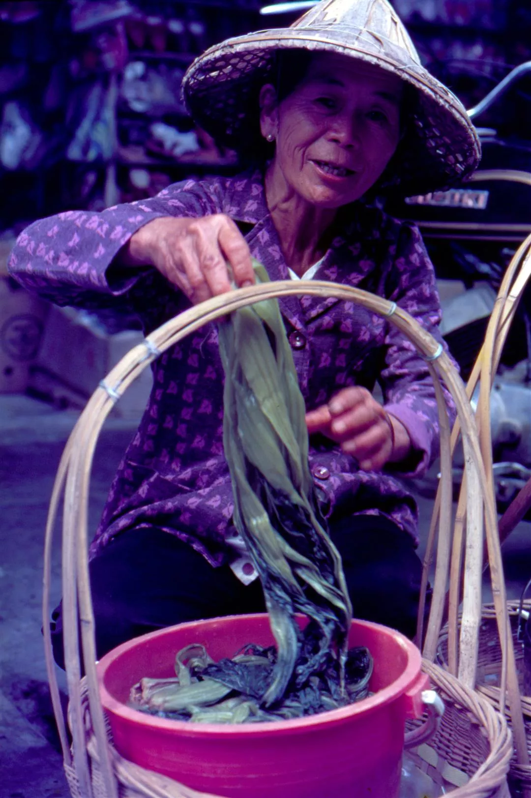 4. A market vendor hawks her tasty salted vegetables.