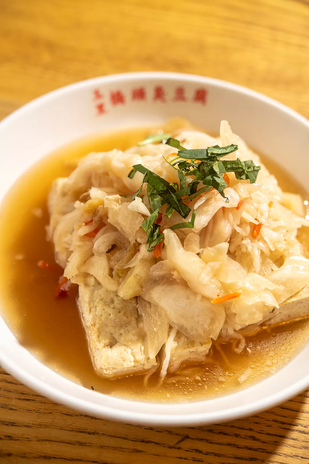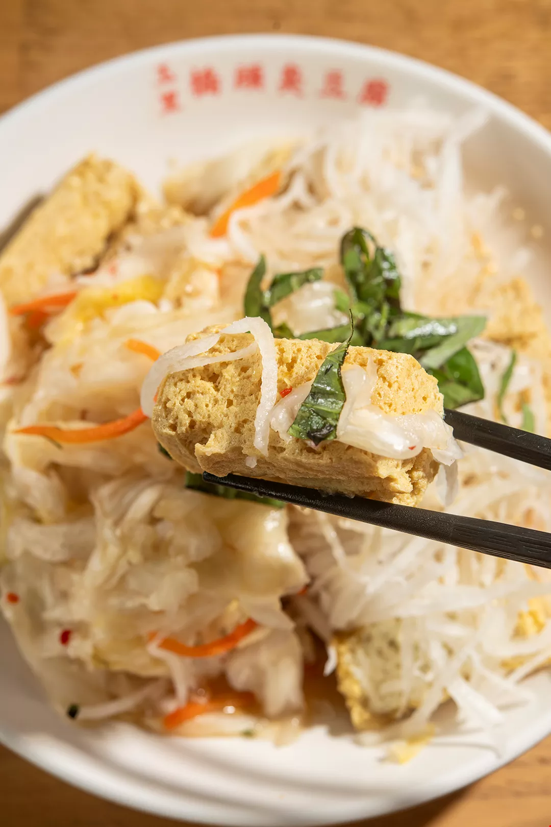 Qiaotou Stinky Tofu, whose chou doufu is crispy on the outside and soft inside, serves its marquee product with crisp pickled vegetables, refreshing shredded radish, and a specially made sauce, garnished with basil. The combination creates the special flavor that distinguishes the brand.