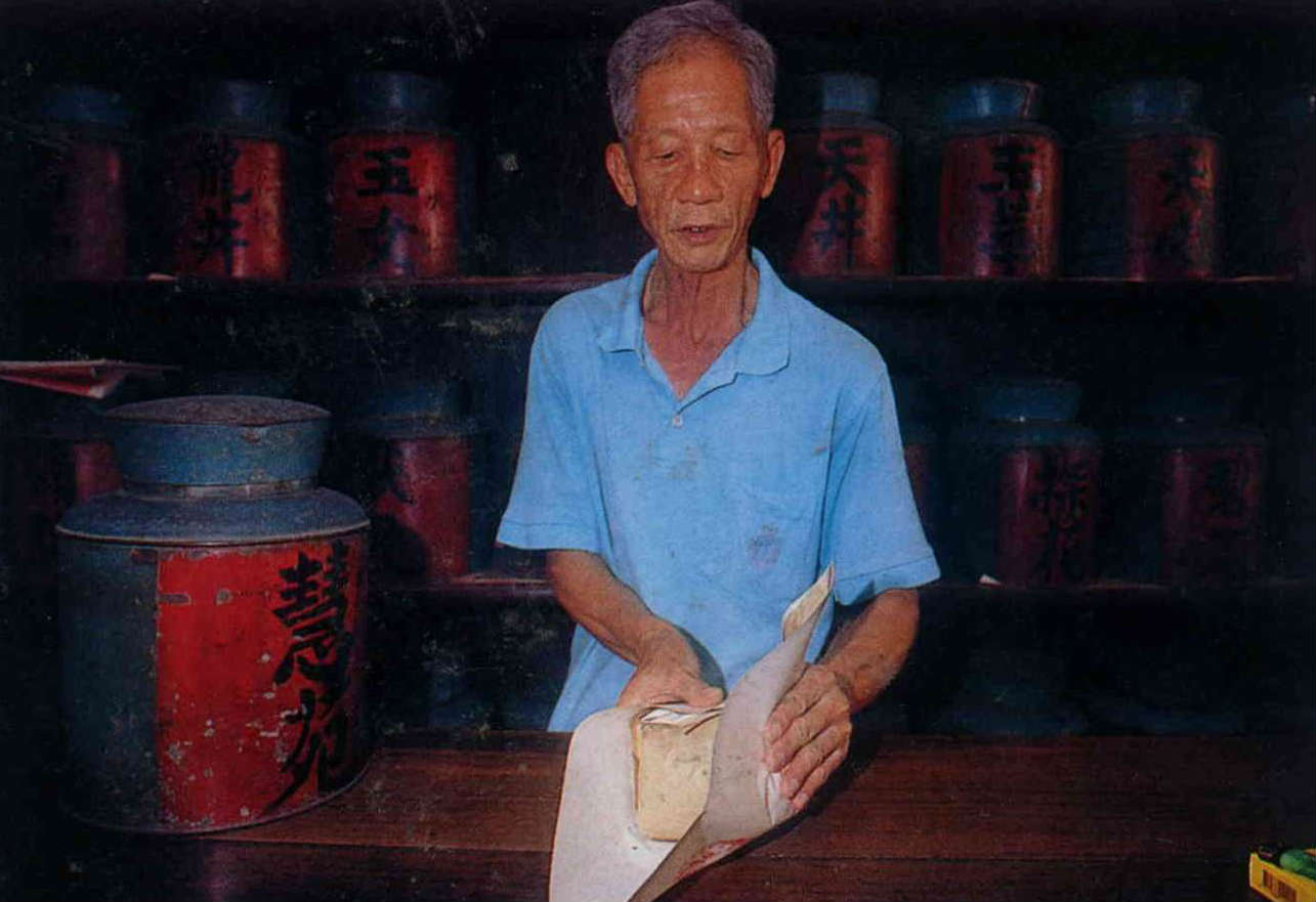 This tea shop in Paiho Township in Tainan County has been operated for t hree generations. Its tea is packaged entirely by hand. The white-haired boss says that yo u have to get the angle just right, that's the only way the tea will be "squared away"--bo th for appearance and permeability to air. This technique of wrapping has nearly been lost in Taiwan's tea industry. The large characters on the tin cans behind the owner are all famous tea growing areas of the past in mainland China.
