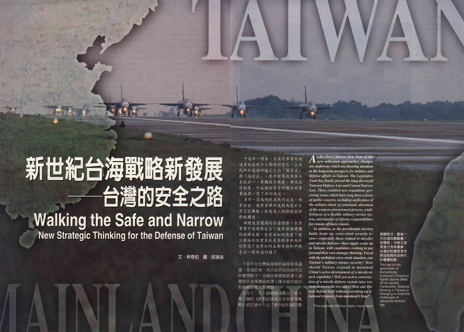 As the first Chinese New Year of the new millenium approaches, changes are underway which are drawing attention to the long-term prospects for military and defense affairs in Taiwan. The Legislative Yuan has finally passed the long-discussed National Defense Law and Coastal Defense Law. These establish new regulations governing issues which have long been a focus of public concern, including unification of the military chain of command, alteration of the weapons procurement process, establishment of a flexible military service system, and transfer of defense responsibilities for remote offshore islands.