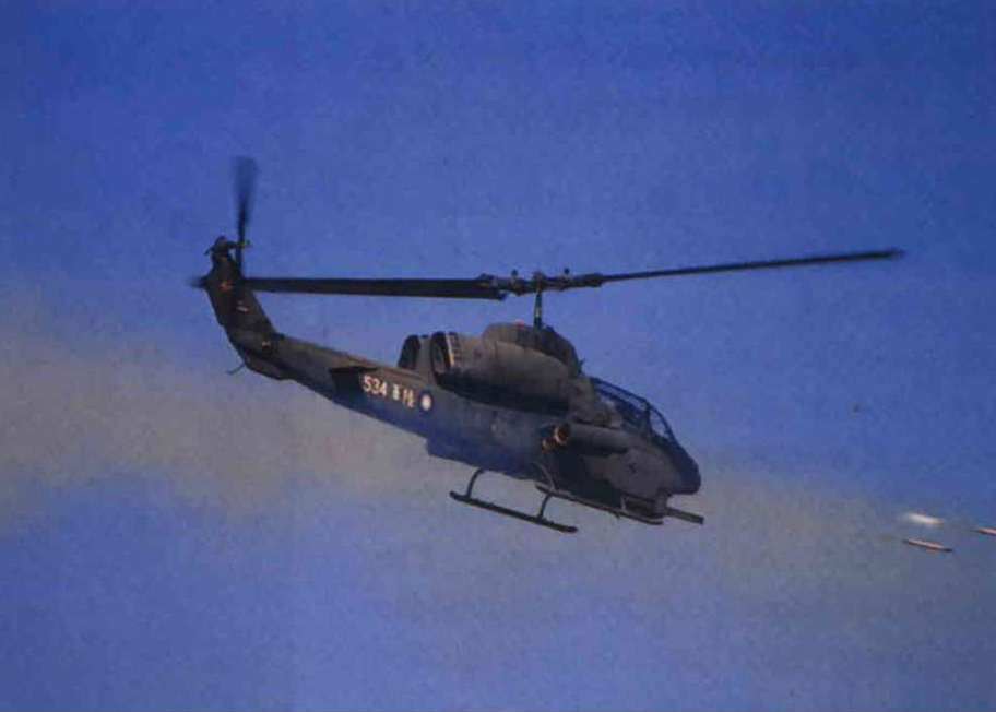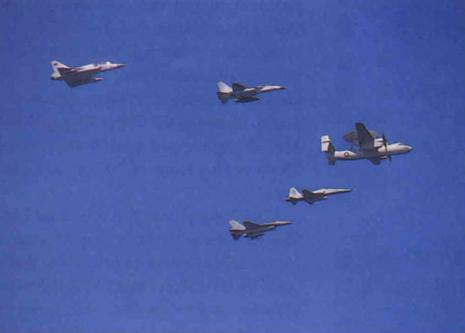 Most of Taiwan's advanced weapons are purchased from overseas. These include (from right to left) Lafayette frigates from France for the Navy, American-made F-16 and French-made Mirage fighters for the Air Force, and US-made AH1W helicopters for the Army.