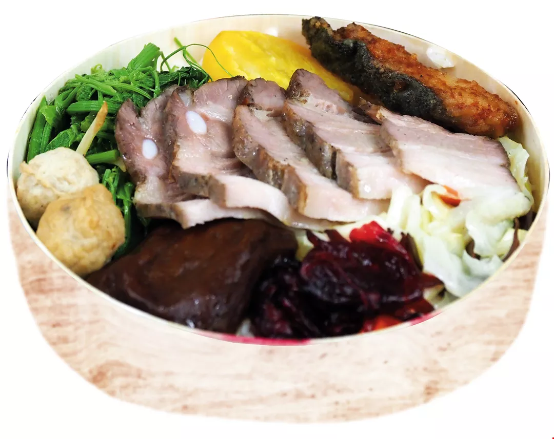 Various TRA restaurants also produce special versions with local ingredients, such as the Roasted Cherry Duck Bento produced by the Qidu Catering Service Center in Keelung, which includes slices of Cherry Valley duck from Yilan, kumquats, also from Yilan, and dried radish omelet made with Sanxing scallions. These specialties made with locally sourced ingredients boast low food miles and express local character. They are not sold onboard trains, but must be purchased at bento shops inside TRA stations. Daily supply is limited, so netizens have nicknamed them “hidden bento.”
