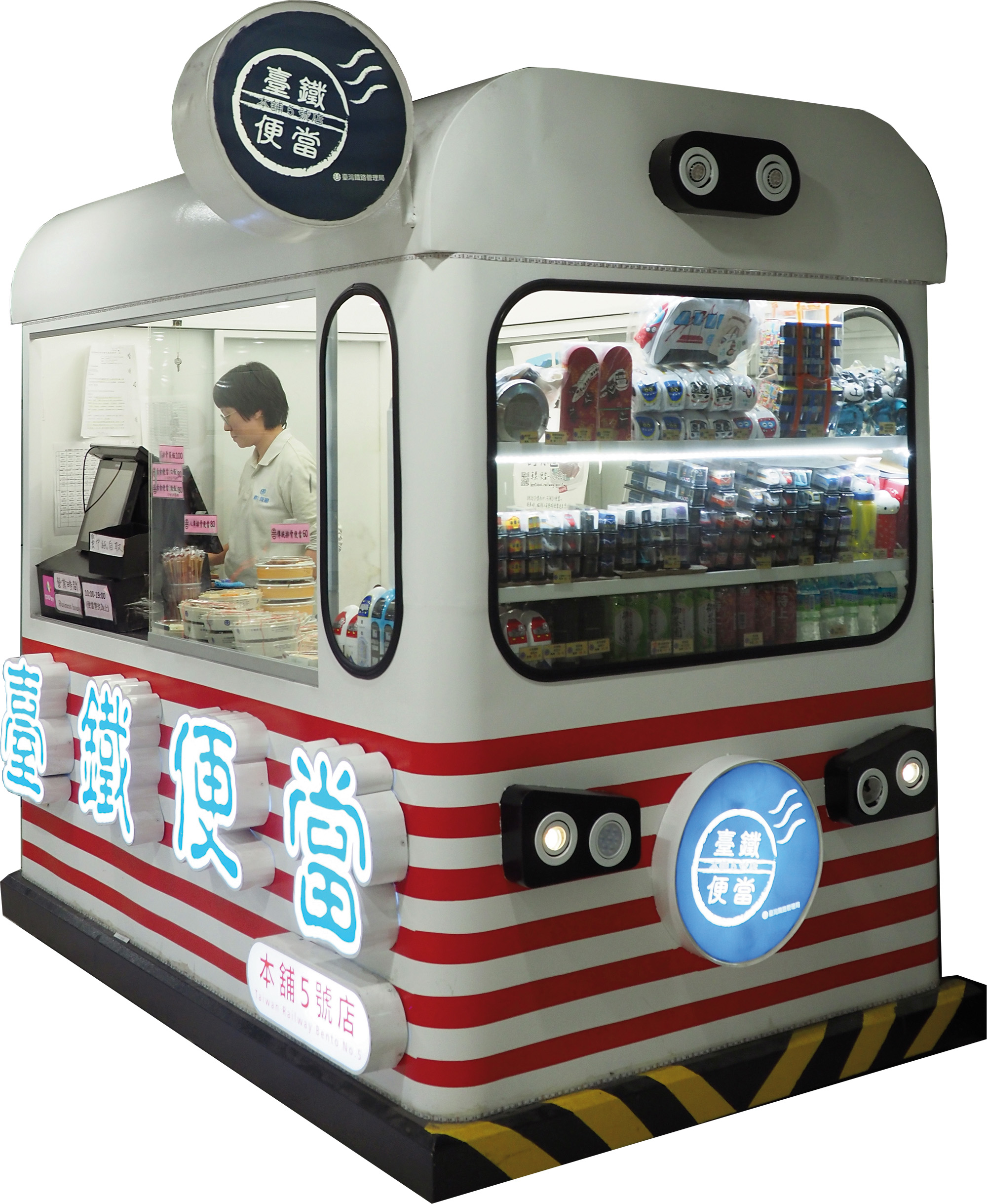 A bento kiosk—outfitted to mimic a train carriage—is located in the B1 level of the Taipei Railway Station.