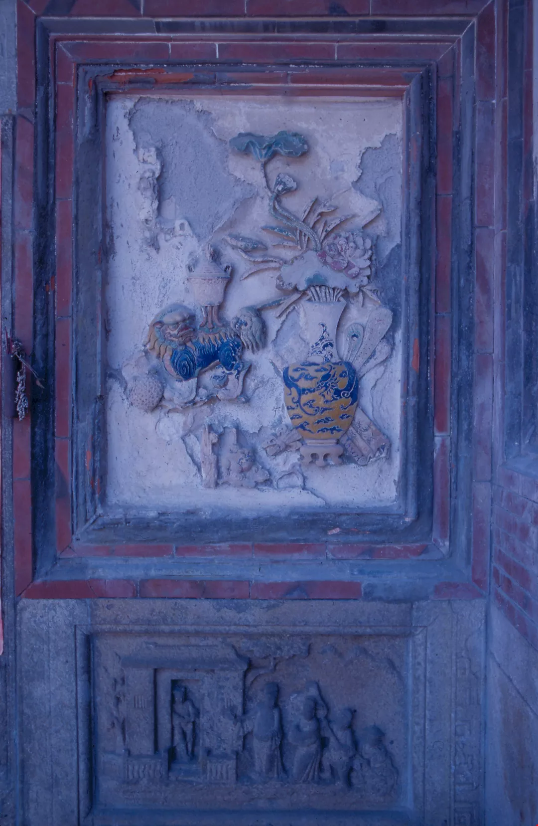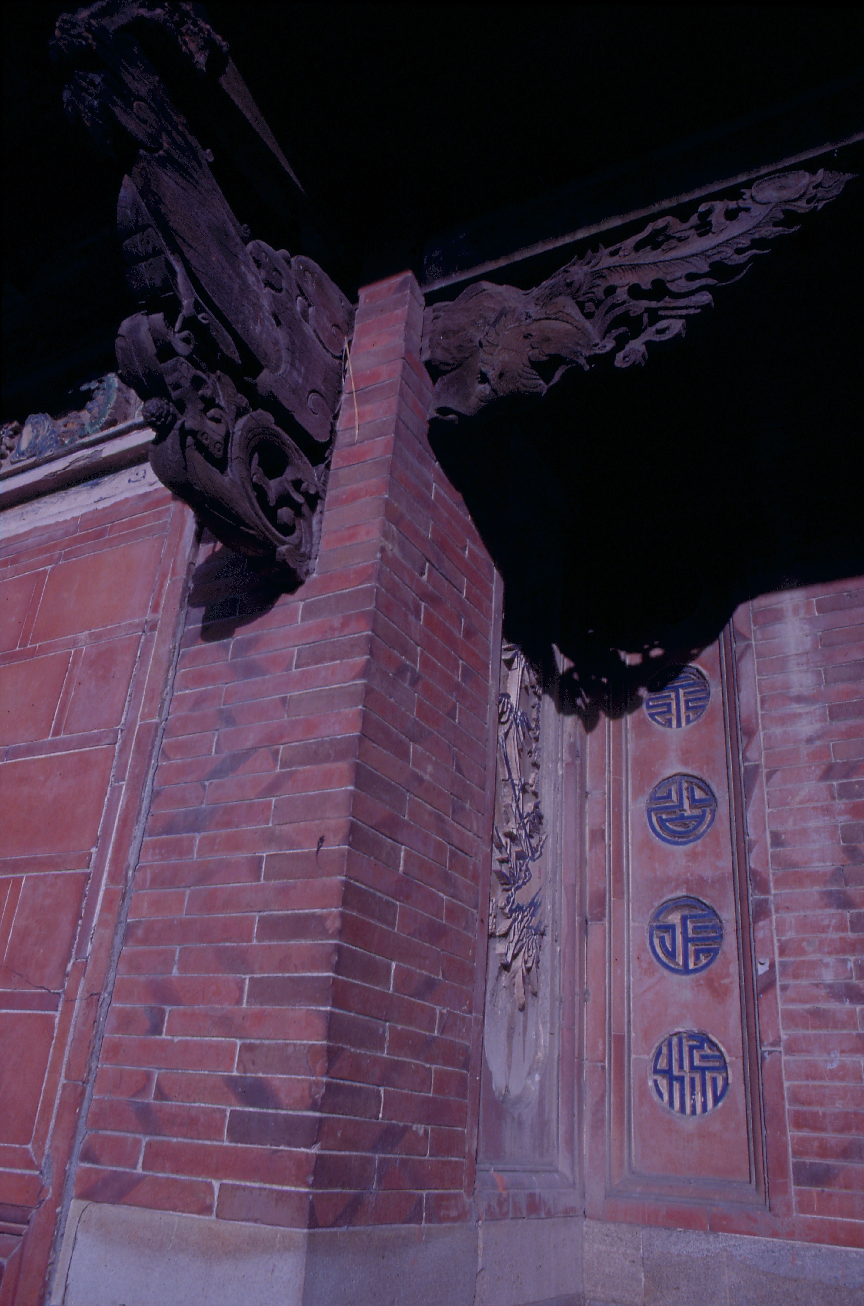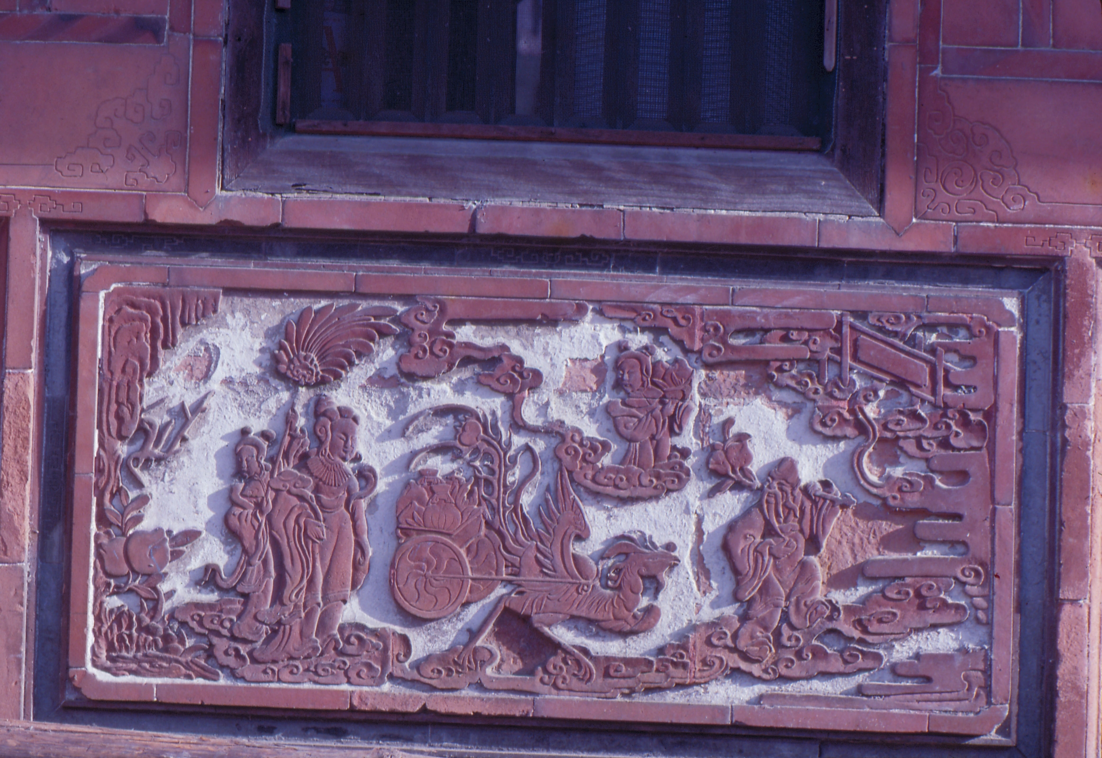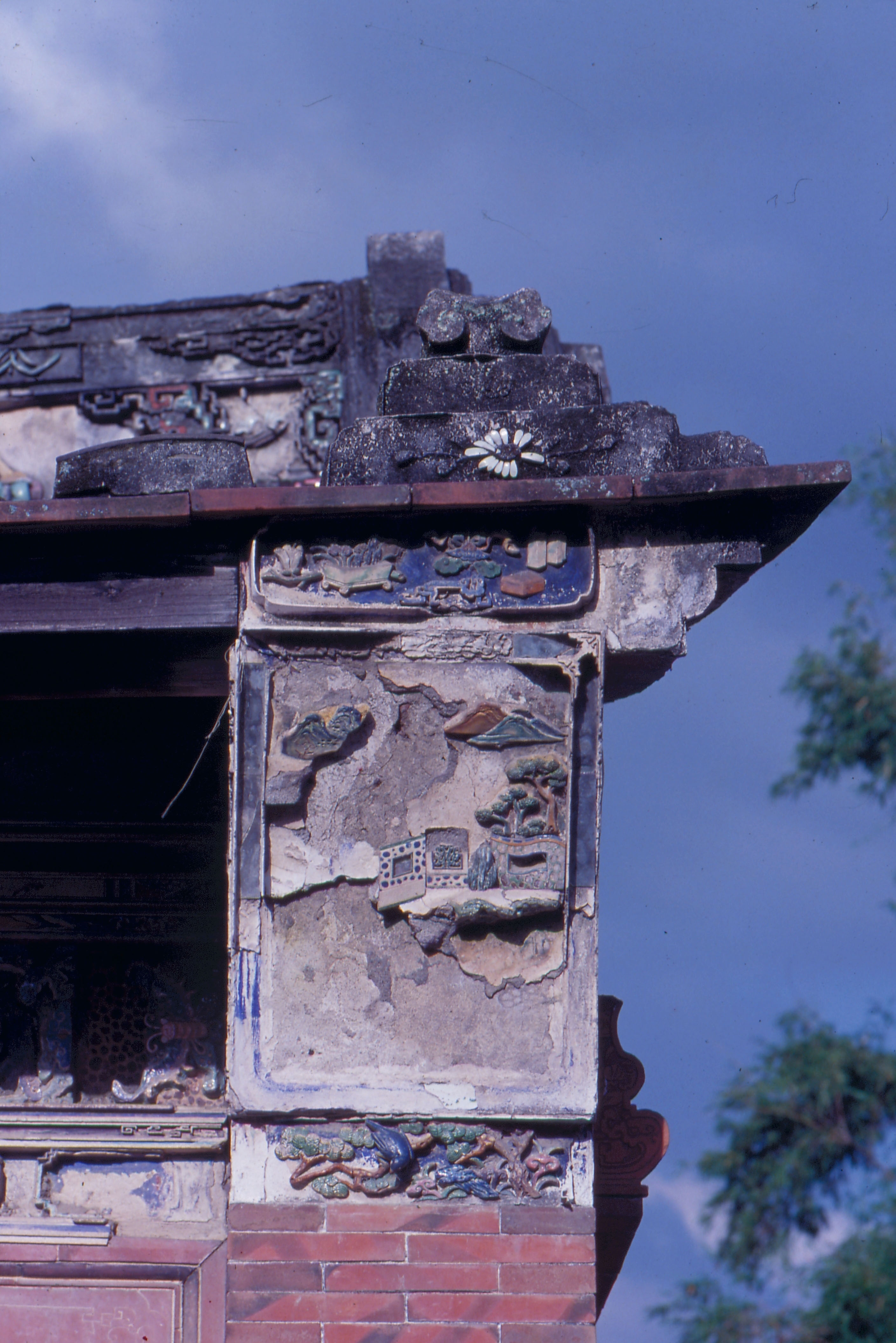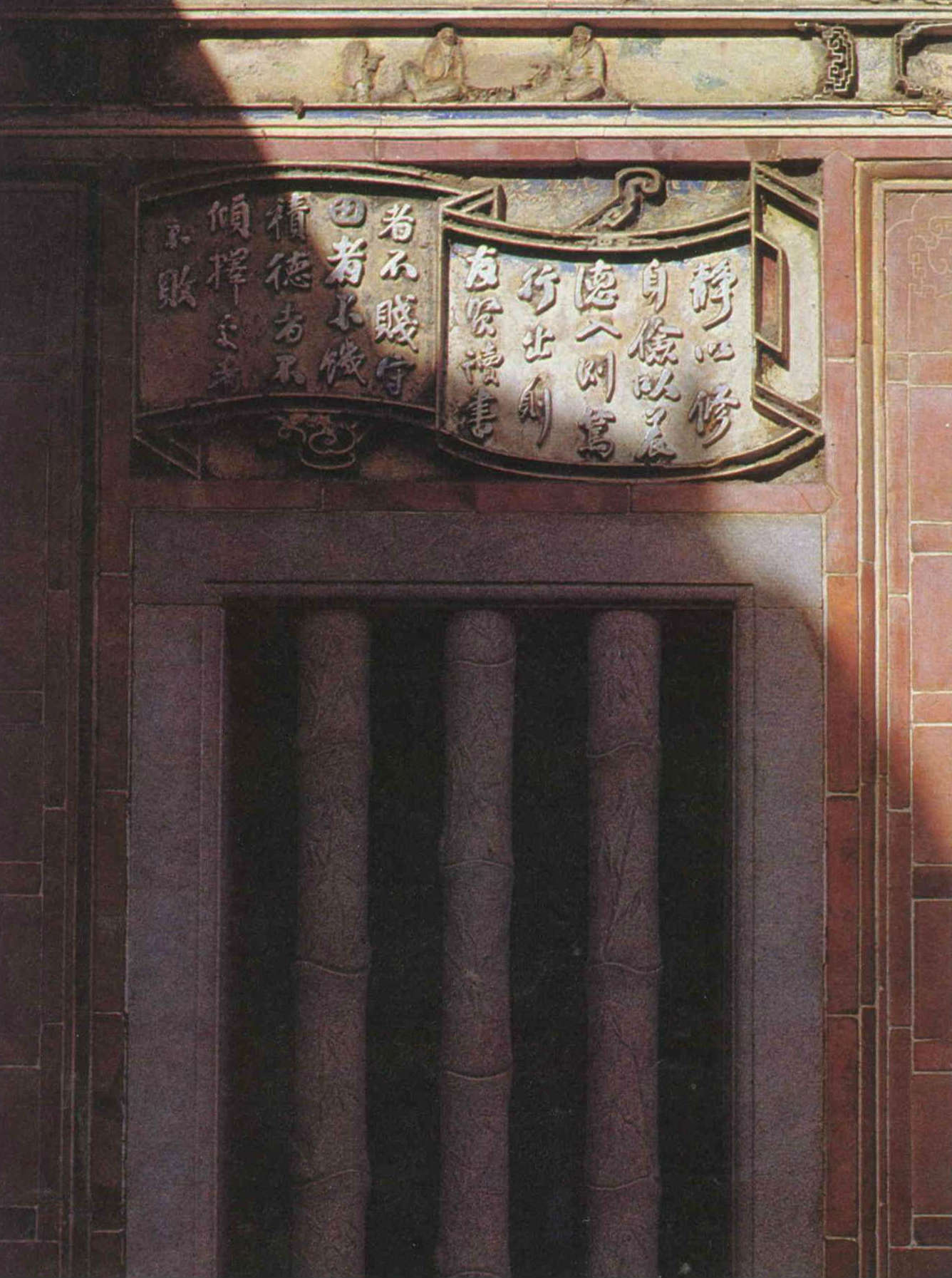 Throughout the house one can see magnificent objects and gorgeous colors. The fact that there is no place in the whole compound "without engravings, paintings or literature" has been called Chai Hsing's most outstanding feature. On the gate tower are horizontal and vertical rows of characters. The upper section beside the gate has red bricks carved into the shape of water caltrop, fans or peaches. The lower part is a solid slab featuring engravings of flowers, plants, birds and trees. The wall averages 50 or 60 centimeters thick, 100 at some points. The main door's frame is etched with the vibrant Eight Immortals. Red tiles cover the roof, with the ridge shaped like the spine of a horse. The center portion bends down and both ends arch upward, thereby forming an attractive curve. On top are sculptures of the human figure in action.