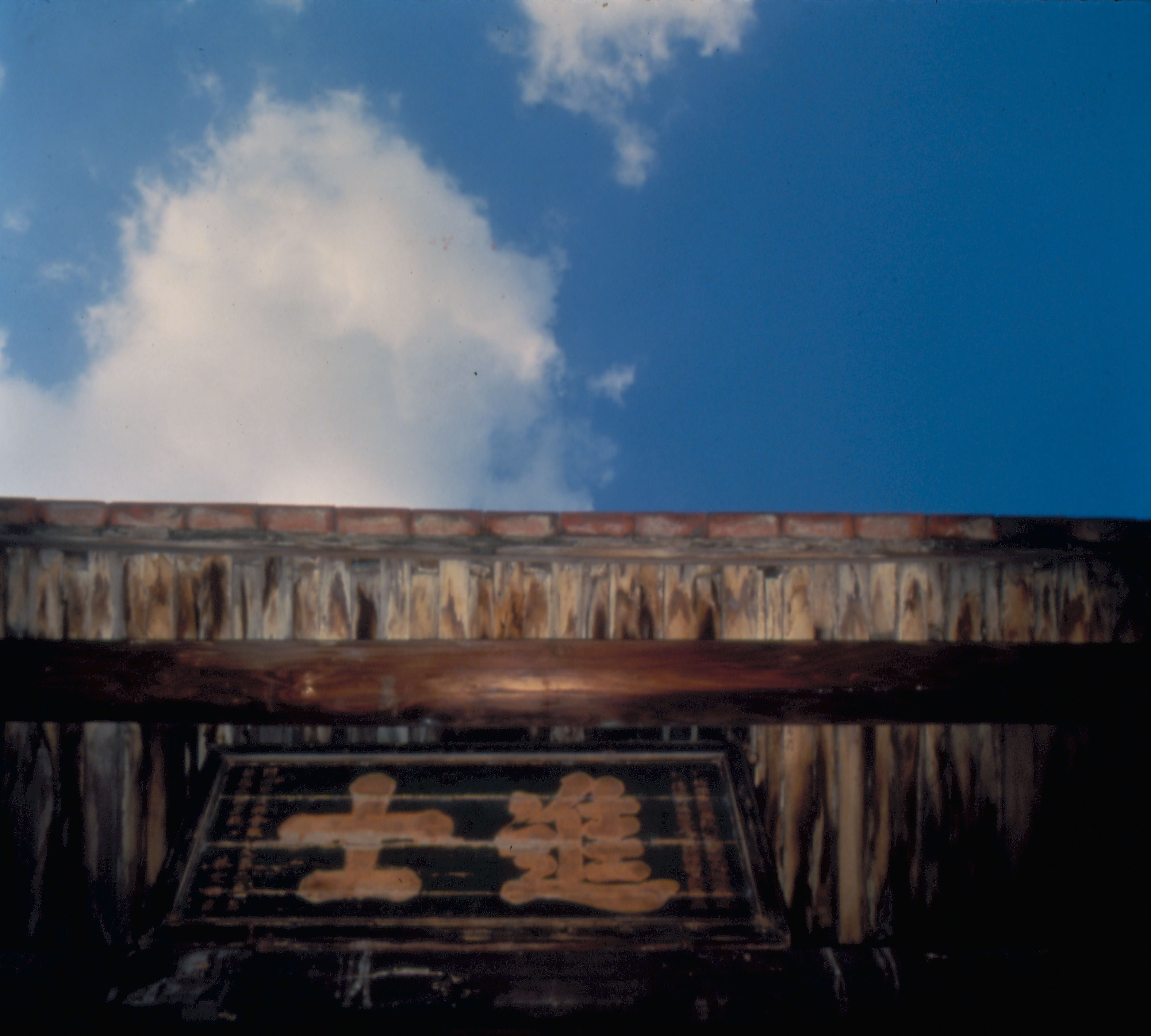 1. Calligraphy outside the door commemorates the construction of the house. 2. Sanctuary in the main hall has been a memorial for Wang Cheng-chu and the departed of the Lin family. 3. A yawning fairy and a reminder that an outstanding and talented man must study. 4. A wall plaque, won as a prize, hanging outside the door. A tablet and door frame carved out of stone, decorated with sculptures of the Eight Immortals. 5. Chiao Chih ceramics on a wall, chipped and cracked to the point that their original form is hardly discernible. 6. Elegant tile wall and sculpture are among Taiwan's ancient treasures. 7. Heavy wooden door, more than a century old, continues its task of keeping intruders out.