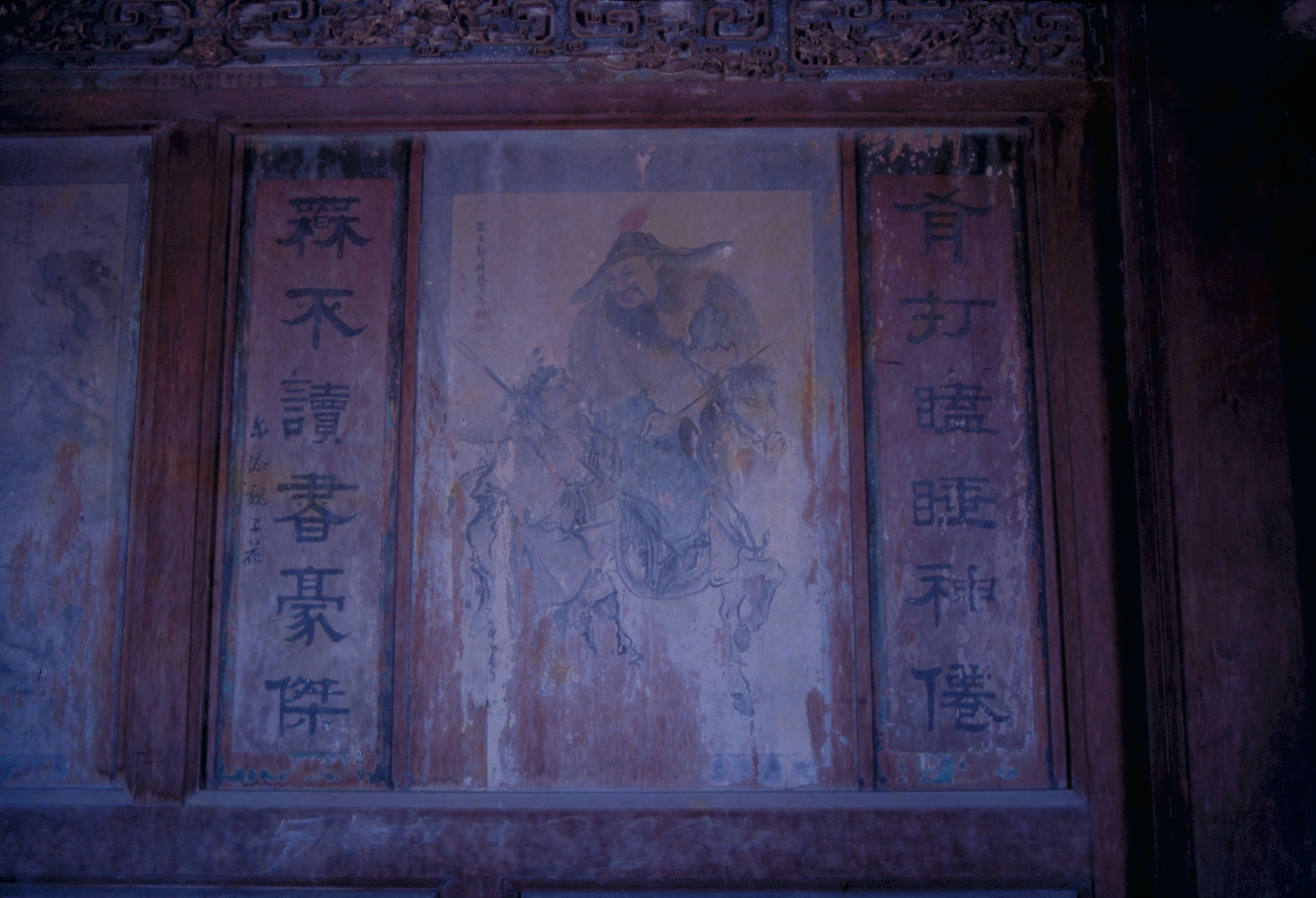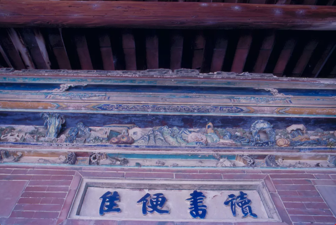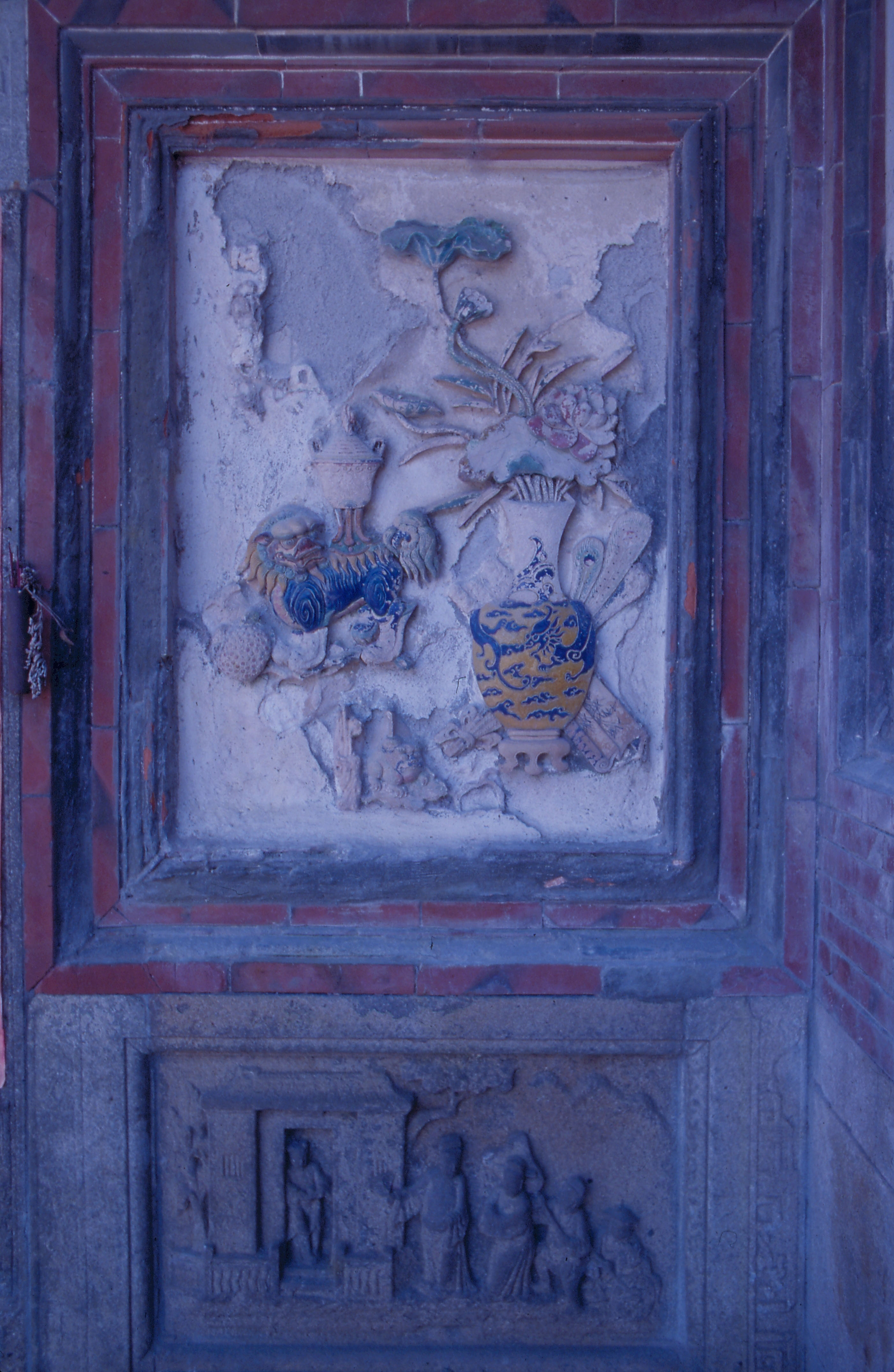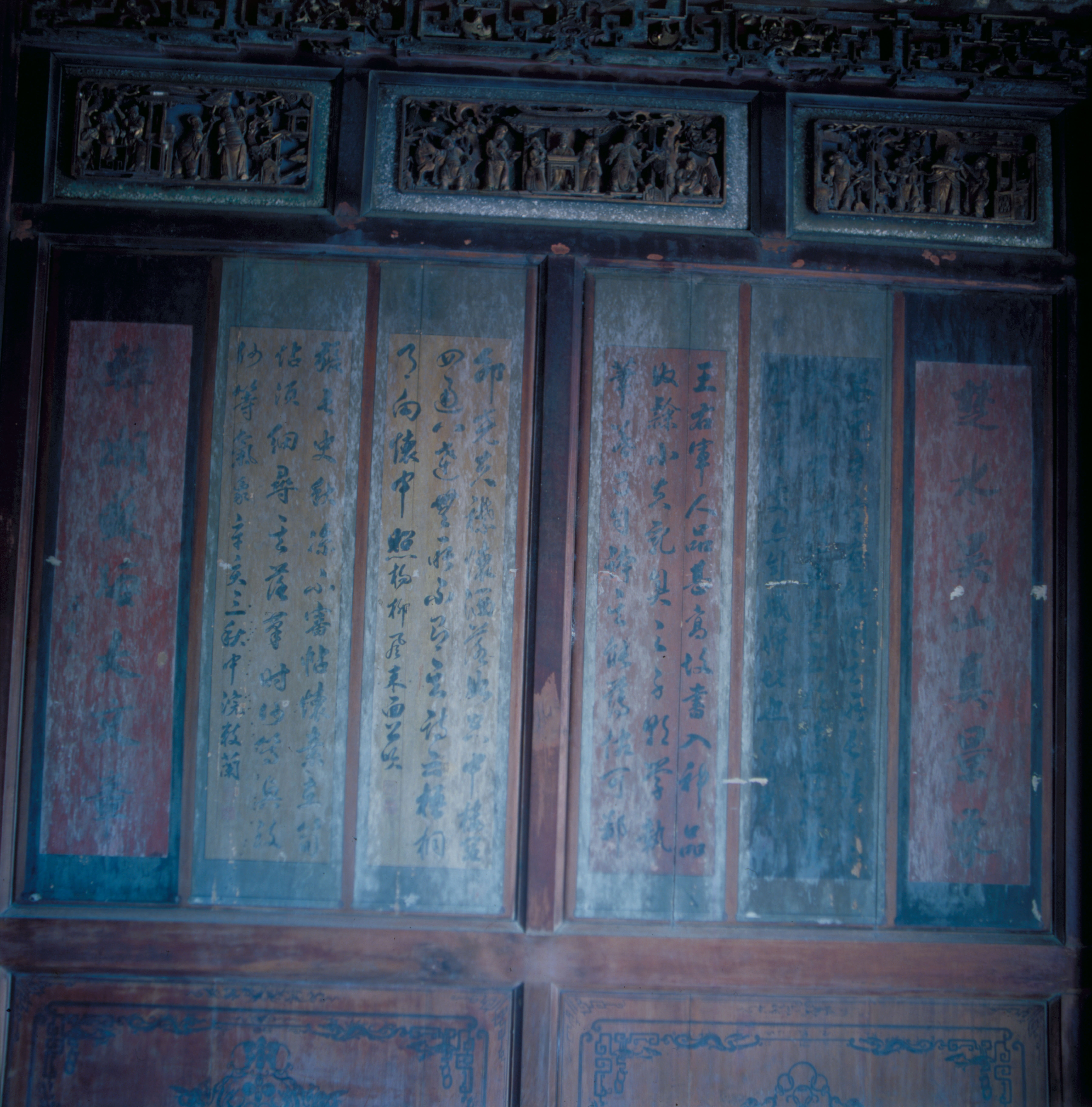 1. Indigo porcelain calligraphy on a doorway beam. Note the fancy Chiao Chih ceramics.