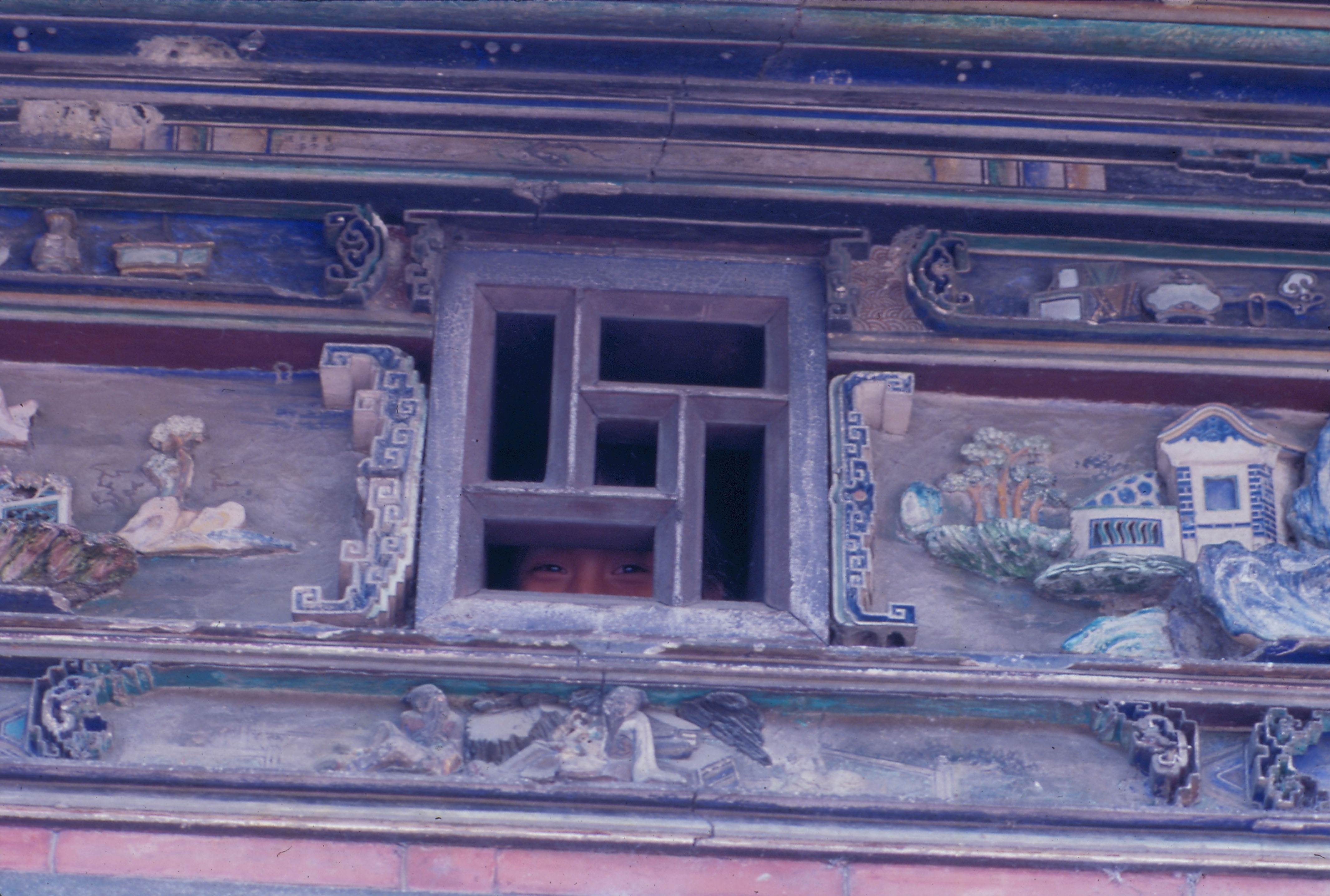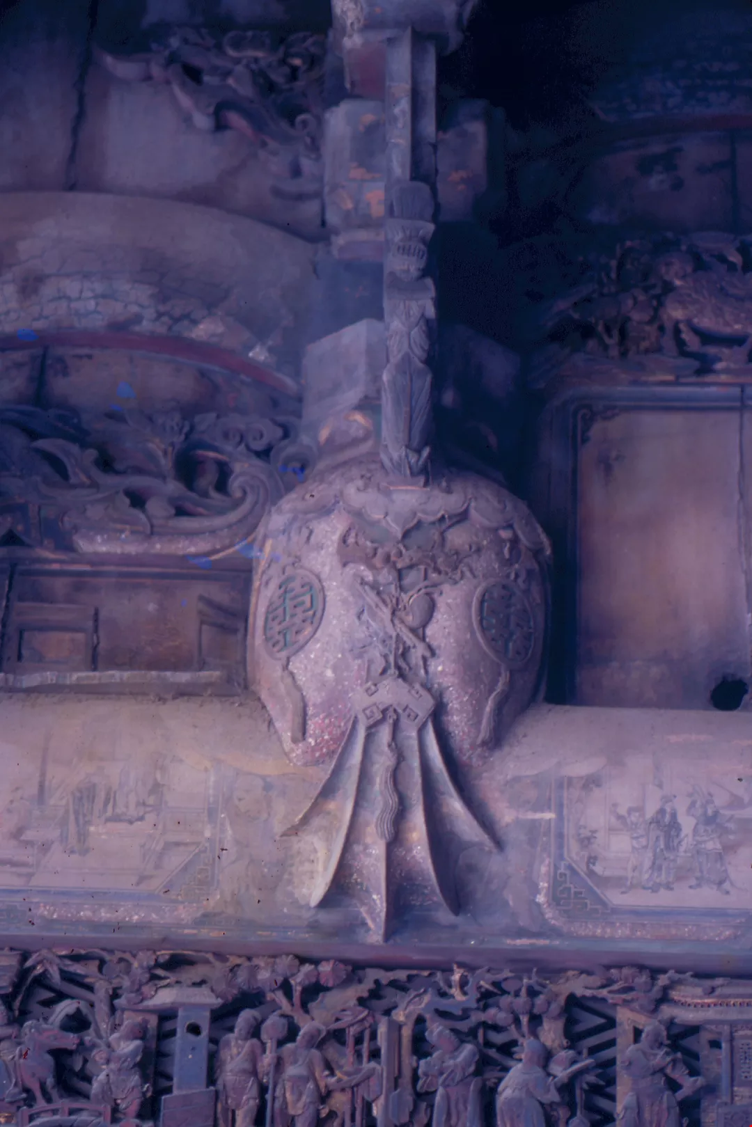 1. Indigo porcelain calligraphy on a doorway beam. Note the fancy Chiao Chih ceramics. 2. Chiao Chih ceramics under the eaves, with a small window for ventilation. 3. Numerous wood carvings depicting historical events give a certain magnificence to the walls of the main room. 4. Masterfully sculptured scenes done in Chiao Chih represent selected folk tales. 5. Exposure to the elements is hard on the old relics. Over the past two years, the chipping and cracking has grown worse. 6. Gourd-shaped pendant, beam and bracket are colorfully decorated and carved.