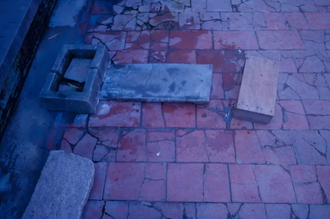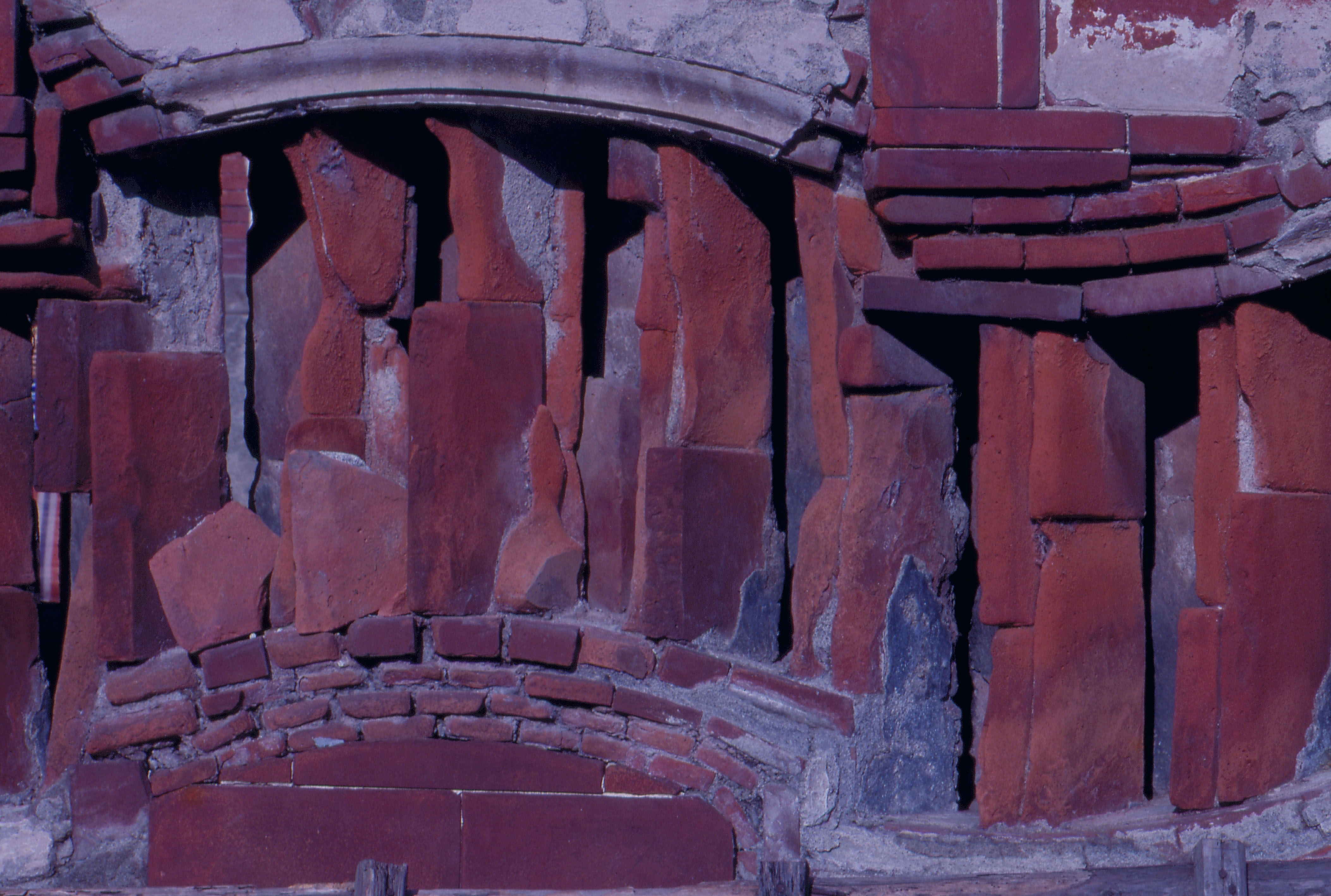 5. Chiao Chih ceramics on a wall, chipped and cracked to the point that their original form is hardly discernible.