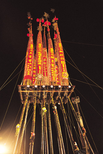 As the first of the two seventh months draws to a close, it so happens that the eve of the traditional "closing of the ghostly gate" falls between a Saturday and a Sunday. That night, leaders of 26 Toucheng neighborhoods (including two that have since been incorporated into Chiaohsi Township) gather together in a mounting mood of festiveness mingled with apprehension. Platforms have been erected in front of the various temples, and elderly devotees lead the young people in constructing the long, tapering poles (guzhan) that will be erected upon the main platform (gupeng). At the Shennung Temple in Paya Borough (formerly Patsailin), the pole that is being rushed to completion towers 30 meters, or about ten stories high.