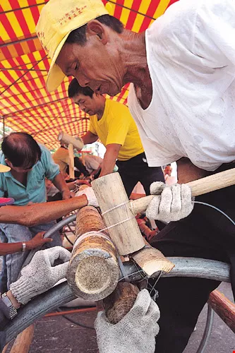 "There are 13 poles set up on this platform, but only ours can really be called a 'wind god' pole," says Wei Tsung-tai, chairman of the Shennung Temple. In the past, Patsailin was populated by strong, rough-and-tumble farmers. When the practice of qianggu began, says Wei, "Other villages would bring their poles in horizontally, but the folks of Patsailin were different, carrying their poles in straight up to the meeting place in an especially awe-inspiring manner."