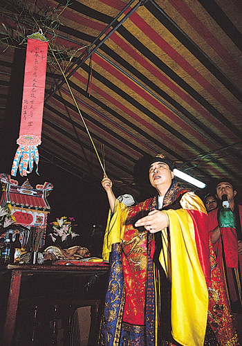 Li Yu-tang, head of the Shengyuan Shrine in Toucheng and a third-generation ritual master, is responsible for all of the religious rites at this year's qianggu festival. He arrives with 20 of his fellow adepts. Li recommends that the lanterns be set at about ten feet high. Drawing on the experience of their predecessors, he reasons that, although the festival is known throughout Taiwan, Toucheng is after all a small locality that does not need overly lofty lanterns. Setting the lanterns at a modest height will avoid the inauspicious situation of having hungry ghosts from neighboring villages and townships crossing over into Toucheng.